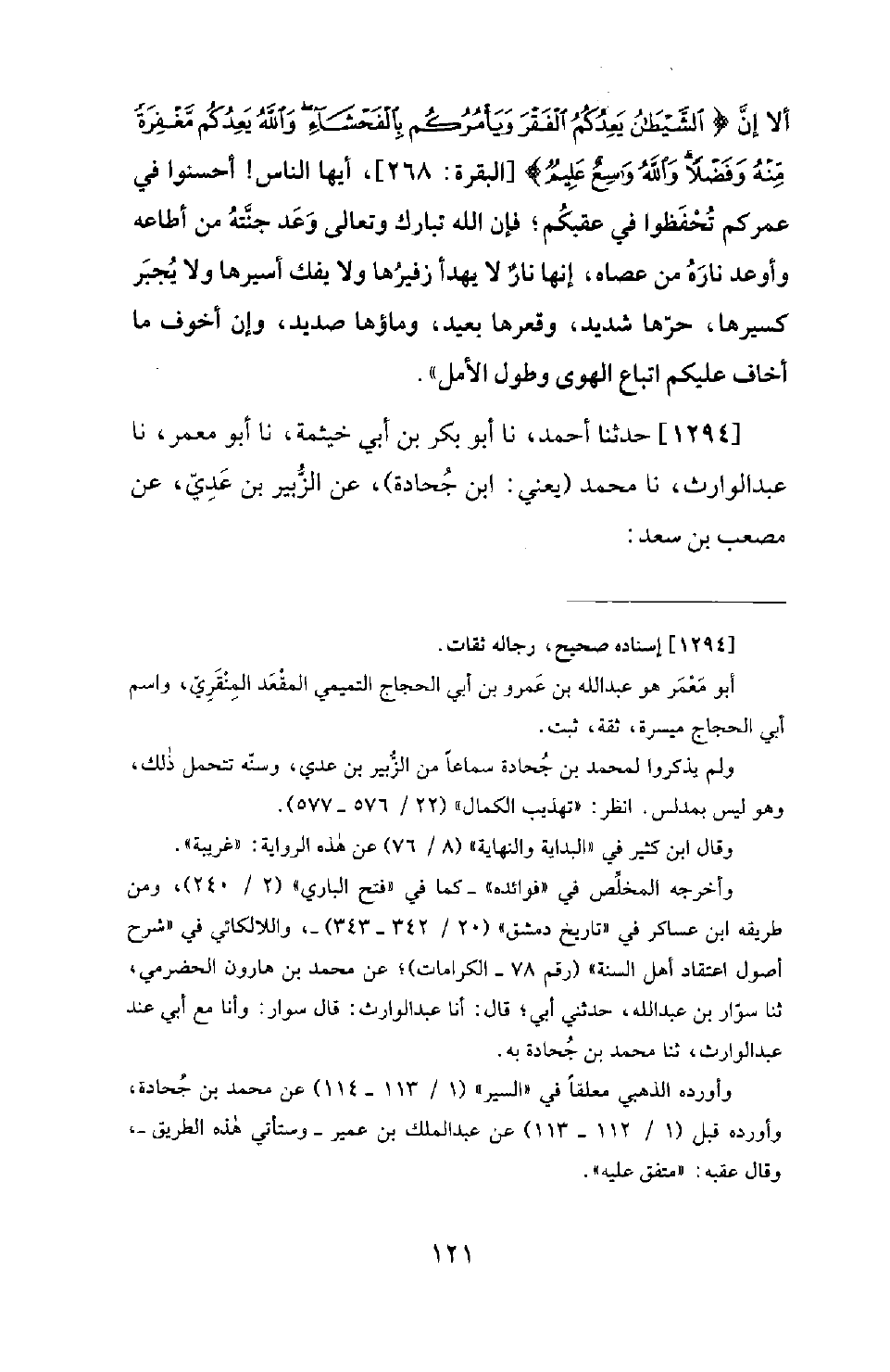 1294 - حَدَّثَنَا أَحْمَدُ، نَا أَبُو بَكْرِ بْنُ أَبِي خَيْثَمَةَ، نَا أَبُو مَعْمَرٍ، نَا عَبْدُ الْوَارِثِ، نَا مُحَمَّدٌ (يَعْنِي: ابْنَ جُحَادَةَ) ، عَنِ الزُّبَيْرِ بْنِ عَدِيٍّ، عَنْ مُصْعَبِ بْنِ سَعْدٍ: -[122]- أَنَّ سَعْدَ بْنَ أَبِي وَقَّاصٍ خَطَبَهُمْ بِالْكُوفَةِ، فَقَالَ: يَا أَهْلَ الْكُوفَةِ! أَيُّ أَمِيرٍ كُنْتُ لَكُمْ؟ فَقَامَ إِلَيْهِ رَجُلٌ، فَقَالَ: اللهُمَّ إِنْ كُنْتَ مَا عَلِمْنَا لا تَعْدِلُ فِي الرَّعِيَّةِ وَلا تَقْسِمُ بِالسَّوِيَّةِ وَلا تَغْزُوا فِي السَّرِيَّةِ. فَقَالَ سَعْدٌ: اللهُمَّ إِنْ كَانَ كَاذِبًا؛ فَأَعْمِ بَصَرَهُ، وَعَجِّلْ فَقْرَهُ، وَأَطِلْ عُمْرَهُ، وَعَرِّضْهُ لِلْفِتَنِ. قَالَ: فَمَا مَاتَ حَتَّى عُمِيَ، وَكَانَ يَلْتَمِسُ الْجُدُرَ، وَافْتَقَرَ حَتَّى سَأَلَ النَّاسَ بِكَفِّهِ، وَأَدْرَكَ فِتْنَةَ الْمُخْتَارِ الْكَذَّابِ، فَقَاتَلَ فِيهَا، وَكَانَ إِذَا -[123]- قِيلَ لَهُ: كَيْفَ أَنْتَ؟ يَقُولُ: أَنَا أَعْمَى فَقِيرٌ أَدْرَكَتْنِي دَعَوَاتُ سَعْدٍ