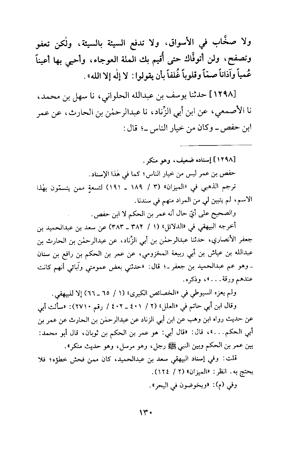 1298 - حَدَّثَنَا يُوسُفُ بْنُ عَبْدِ اللهِ الْحُلْوَانِيُّ، نَا سَهْلُ بْنُ مُحَمَّدٍ، نَا الْأَصْمَعِيُّ، عَنِ ابْنِ أَبِي الزِّنَادِ، نَا عَبْدُ الرَّحْمَنِ بْنُ الْحَارِثِ، عَنْ عُمَرَ بْنِ حَفْصٍ - وَكَانَ مِنْ خِيَارِ النَّاسِ -؛ -[131]- قَالَ: كَانَ عِنْدَ أَبِي وَجَدِّي وَرَقَةٌ يَتَوَارَثُونَهَا قَبْلَ الْإِسْلامِ بِزَمَانٍ، فِيهَا: بِسْمِ اللهِ، وَقَوْلَهُ الْحَقُّ، وَقَوْلَ الظَّالِمِينَ فِي تَبَابٍ، هَذَا الذِّكْرُ لِأُمَّةٍ تَأْتِي فِي آخِرِ الزَّمَانِ، يَأْتَزِرُونَ عَلَى أَوْسَاطِهِمْ، وَيَغْسِلُونَ أَطْرَافَهُمْ، وَيَخُوضُونَ الْبَحْرَ إِلَى عَدُوِّهِمْ، فِيهِمْ صَلاةٌ، لَوْ كَانَتْ فِي قَوْمِ نُوحٍ مَا هَلَكُوا بِالطُّوفَانِ، وَفِي ثَمُودَ مَا أُهْلِكُوا بِالصَّيْحَةِ. قَالَ: فَأَخْبَرَنِي أَنَّهُمْ جَاءُوا بِهَا إِلَى النَّبِيِّ صَلَّى اللَّهُ عَلَيْهِ وَسَلَّمَ؛ فَأَمَرَهُمْ أَنْ يَحْتَفِظُوا بِهَا