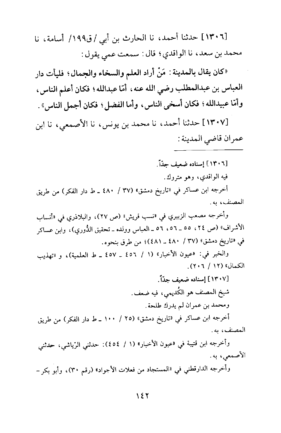 1306 - حَدَّثَنَا أَحْمَدُ، نَا الْحَارِثُ بْنُ أَبِي أُسَامَةَ، نَا مُحَمَّدُ بْنُ سَعْدٍ، نَا الْوَاقِدِيُّ؛ قَالَ: سَمِعْتُ عَمِّي يَقُولُ: كَانَ يُقَالُ بِالْمَدِينَةِ: مَنْ أَرَادَ الْعِلْمَ وَالسَّخَاءَ وَالْجَمَالَ؛ فَلْيَأْتِ دَارَ الْعَبَّاسِ بْنِ عَبْدِ الْمُطَّلِبِ رَضِيَ اللهُ عَنْهُ، أَمَّا عَبْدُ اللهِ؛ فَكَانَ أَعْلَمَ النَّاسِ، وَأَمَّا عُبَيْدُ اللهِ؛ فَكَانَ أَسْخَى النَّاسِ، وَأَمَّا الْفَضْلُ؛ فَكَانَ أَجْمَلَ النَّاسِ