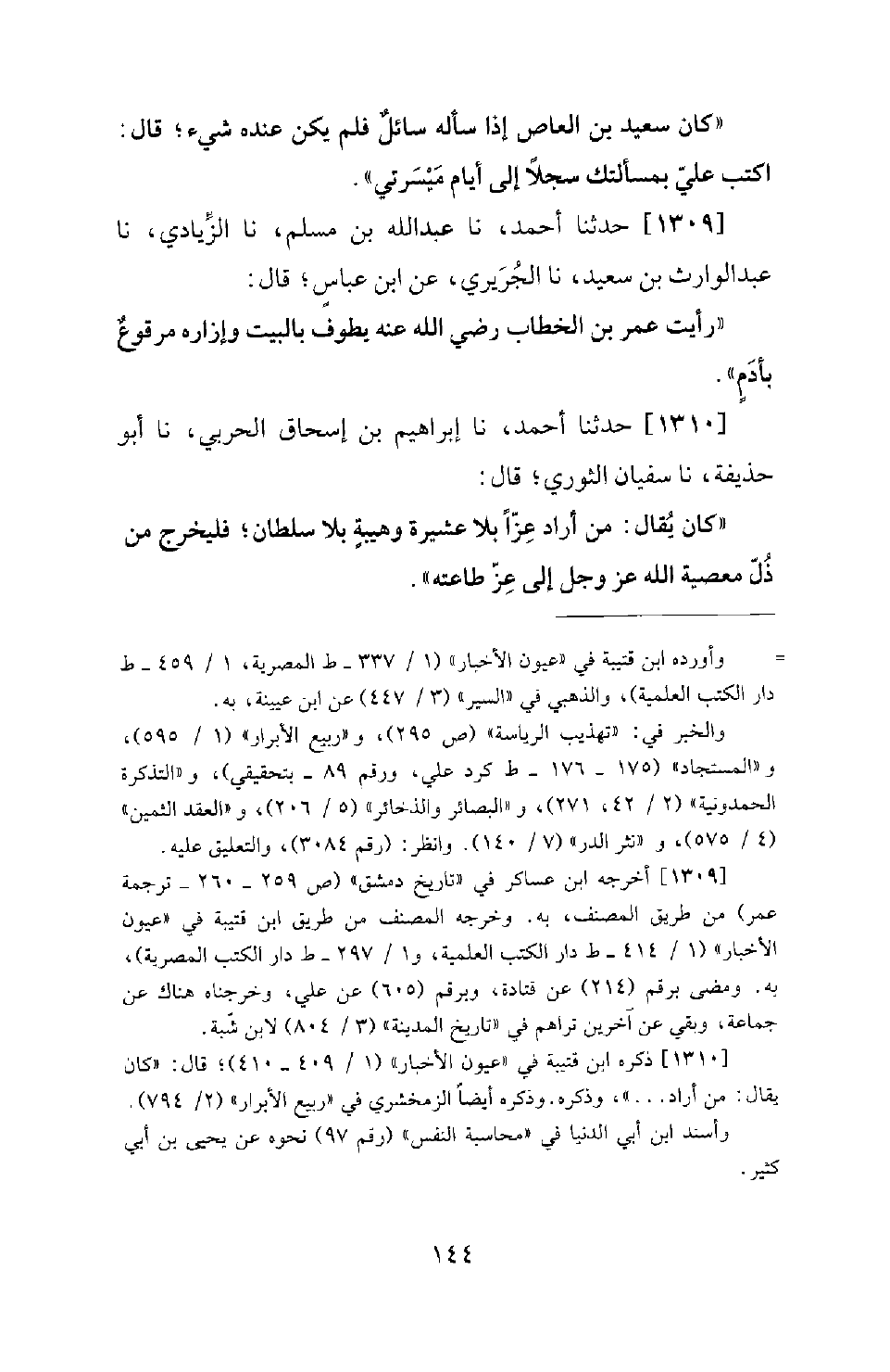 1310 - حَدَّثَنَا أَحْمَدُ، نَا إِبْرَاهِيمُ بْنُ إِسْحَاقَ الْحَرْبِيُّ، نَا أَبُو حُذَيْفَةَ، نَا سُفْيَانُ الثَّوْرِيُّ؛ قَالَ: كَانَ يُقَالُ: مَنْ أَرَادَ عِزًّا بِلا عَشِيرَةٍ، وَهَيْبَةً بِلا سُلْطَانٍ؛ فَلْيَخْرُجْ مِنْ ذُلِّ مَعْصِيَةِ اللهِ عَزَّ وَجَلَّ إِلَى عِزِّ طَاعَتِهِ.