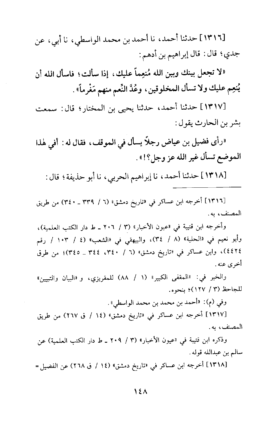 1317 - حَدَّثَنَا أَحْمَدُ، حَدَّثَنَا يَحْيَى بْنُ الْمُخْتَارِ؛ قَالَ: سَمِعْتُ بِشْرَ بْنَ الْحَارِثِ يَقُولُ: رَأَى فُضَيْلُ بْنُ عِيَاضٍ رَجُلًا يَسْأَلُ فِي الْمَوْقِفِ، فَقَالَ لَهُ: أَفِي هَذَا الْمَوْضِعِ تَسْأَلُ غَيْرَ اللهِ عَزَّ وَجَلَّ؟ !