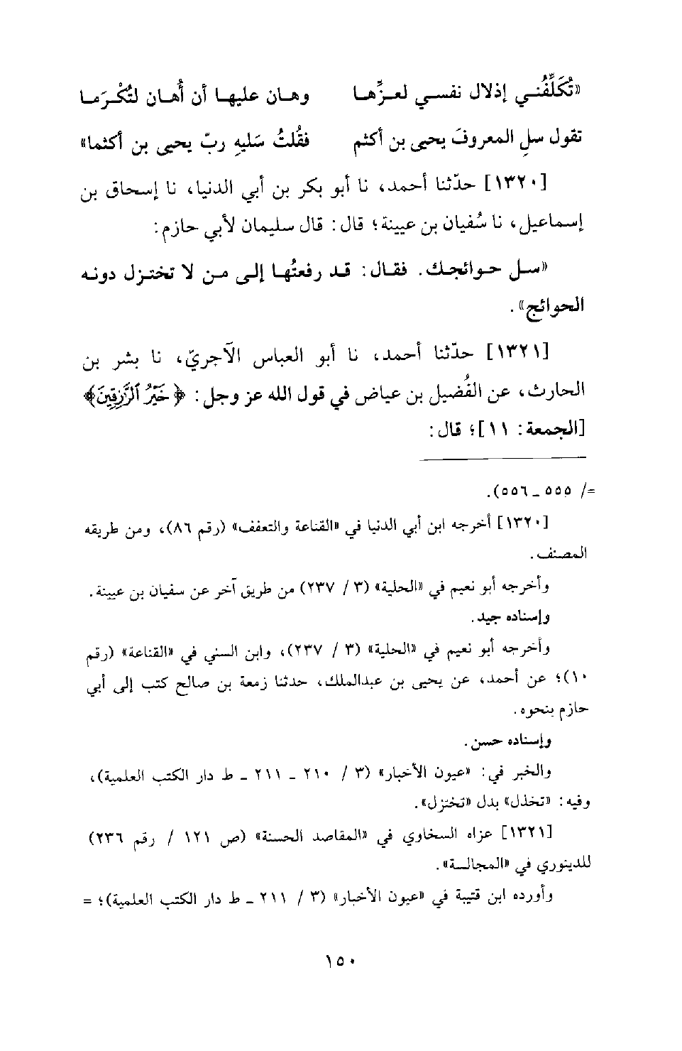 1320 - حَدَّثَنَا أَحْمَدُ، نَا أَبُو بَكْرِ بْنُ أَبِي الدُّنْيَا، نَا إِسْحَاقُ بْنُ إِسْمَاعِيلَ، نَا سُفْيَانُ بْنُ عُيَيْنَةَ؛ قَالَ: قَالَ سُلَيْمَانُ لِأَبِي حَازِمٍ: سَلْ حَوَائِجَكَ. فَقَالَ: قَدْ رَفَعْتُهَا إِلَى مَنْ لا تُخْتَزَلُ دُونَهُ الْحَوَائِجُ.