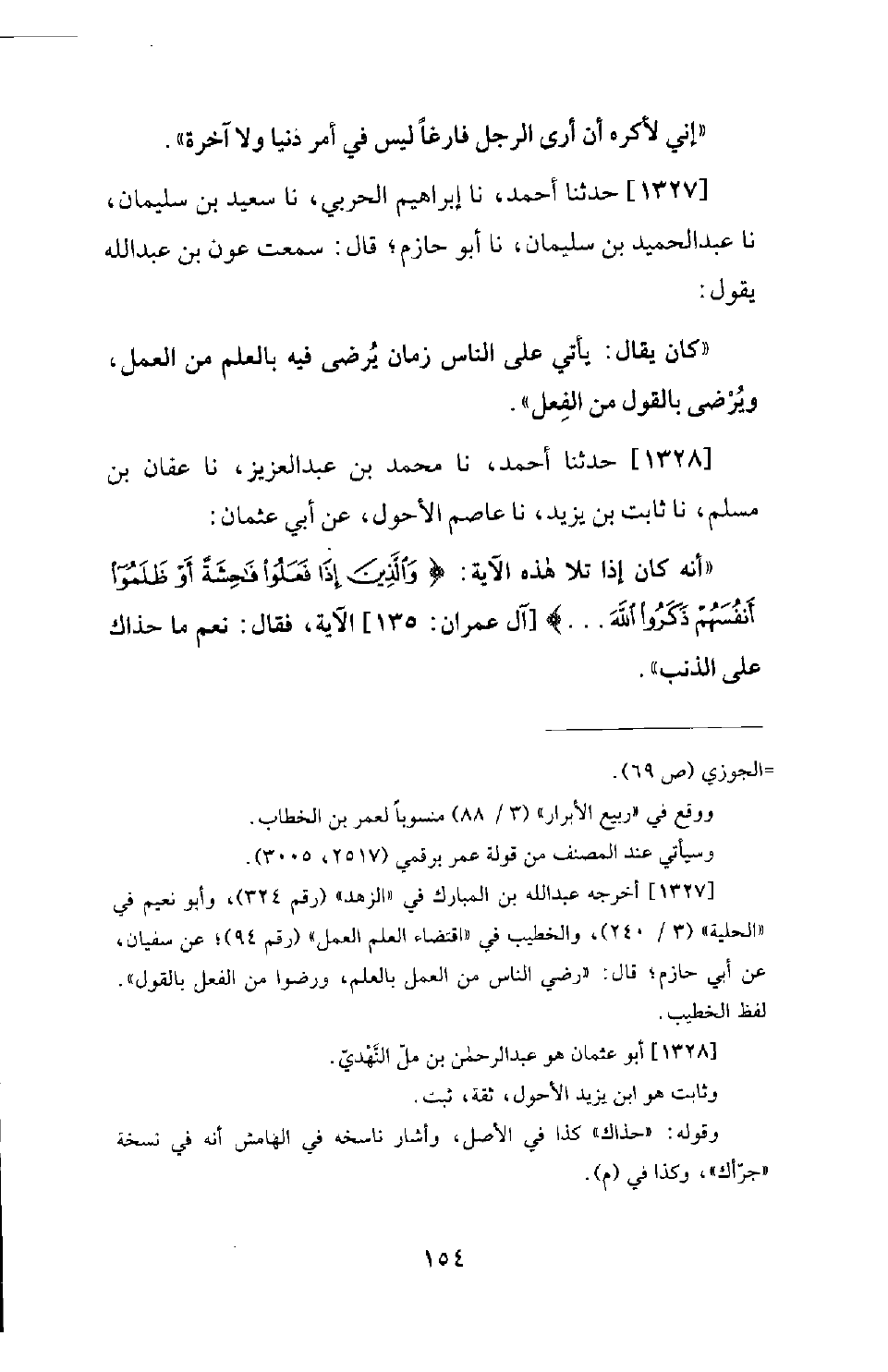 1328 - حَدَّثَنَا أَحْمَدُ، نَا مُحَمَّدُ بْنُ عَبْدِ الْعَزِيزِ، نَا عَفَّانُ بْنُ مُسْلِمٍ، نَا ثَابِتُ بْنُ يَزِيدَ، نَا عَاصِمٌ الْأَحْوَلُ، عَنْ أَبِي عُثْمَانَ: أَنَّهُ كَانَ إِذَا تَلا هَذِهِ الْآيَةَ: (وَالَّذِينَ إِذَا فَعَلُوا فَحِشَةً أَوْ ظَلَمُوا أَنْفُسَهُمْ ذَكَرُوا اللهَ) [آل عمران: 135] الآيَةَ؛ فَقَالَ: نَعَمْ مَا جرأك عَلَى الذَّنْبِ.