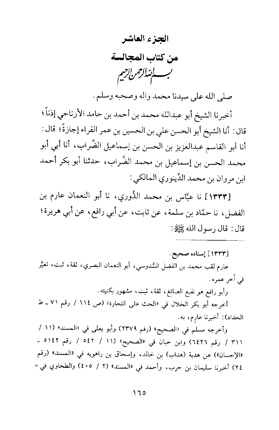 أخبرنا الشيخ أبو عبد الله محمد بن حمد بن حامد الأرتاحي إذنا؛ قال: أنا الشيخ أبو الحسن علي بن الحسين بن عمر الفراء إجازة؛ قا: أنا أبو القاسم عبد العزيز بن الحسن بن إسماعيل الضراب، أنا أبي أبو محمد الحسن بن إسماعيل بن محمد الضراب، حدثنا أبو بكر أحمد بن مروان بن محمد الدينوري المالكي: