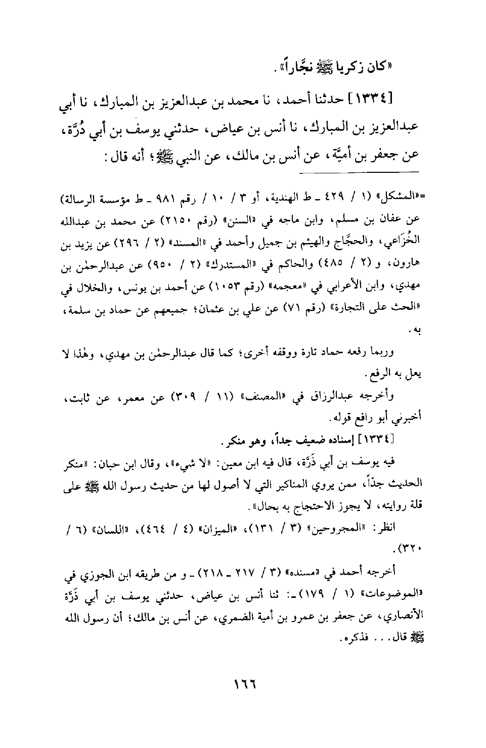 1334 - حَدَّثَنَا أَحْمَدُ، نَا مُحَمَّدُ بْنُ عَبْدِ الْعَزِيزِ بْنِ الْمُبَارَكِ، نَا أَبِي عَبْدُ الْعَزِيزِ بْنُ الْمُبَارَكِ، نَا أَنَسُ بْنُ عِيَاضٍ، حَدَّثَنِي يُوسُفُ بْنُ أَبِي دُرَّةَ، عَنْ جَعْفَرِ بْنِ أُمَيَّةَ، عَنْ أَنَسِ بْنِ مَالِكٍ، عَنِ النَّبِيِّ صَلَّى اللَّهُ عَلَيْهِ وَسَلَّمَ؛ أَنَّهُ قَالَ -[188]-: «مَا مِنْ مُعَمَّرٍ يُعَمَّرُ فِي الْإِسْلامِ أَرْبَعِينَ سَنَةً؛ إِلَّا صَرَفَ اللهُ عَنْهُ ثَلاثَةَ أَنْوَاعٍ مِنَ الْبَلاءِ: الْجُنُونَ، وَالْجُذَامَ، وَالْبَرَصَ. فَإِذَا بَلَغَ الْخَمْسِينَ؛ لَيَّنَ اللهُ عَزَّ وَجَلَّ عَلَيْهِ الْحِسَابَ. فَإِذَا بَلَغَ السِّتِّينَ؛ رَزَقَهُ اللهُ عَزَّ وَجَلَّ الْإِنَابَةَ إِلَيْهِ لَمَا يُحِبُّ وَيَرْضَى. فَإِذَا بَلَغَ السَّبْعِينَ؛ أَحَبَّهُ اللهُ وَأَحَبَّهُ أَهْلُ السَّمَاءِ. فَإِذَا بَلَغَ الثَّمَانِينَ؛ قَبِلَ اللهُ حَسَنَاتِهِ وَتَجَاوَزَ عَنْ سَيِّئَاتِهِ. فَإِذَا بَلَغَ التِّسْعِينَ؛ غَفَرَ اللهُ لَهُ مَا تَقَدَّمَ مِنْ ذَنْبِهِ وَمَا تَأَخَّرَ، وَسُمِّيَ أَسِيرَ اللهِ فِي أَرْضِهِ، وَشُفِّعَ فِي أَهْلِ بَيْتِهِ»