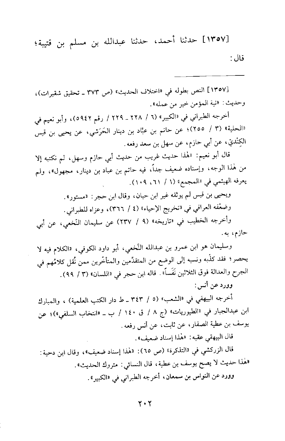 1357 - حَدَّثَنَا أَحْمَدُ، حَدَّثَنَا عَبْدُ اللهِ بْنُ مُسْلِمِ بْنِ قُتَيْبَةَ؛ قَالَ: -[203]- تَأْوِيلُ حَدِيثِ النَّبِيِّ صَلَّى اللَّهُ عَلَيْهِ وَسَلَّمَ؛ أَنَّهُ قَالَ: «نِيَّةُ الْمُؤْمِنِ خَيْرٌ مِنْ عَمَلِهِ» ، وَمَعْنَى هَذَا الْحَدِيثِ حَسَنٌ، وَذَلِكَ أَنَّ اللهَ عَزَّ وَجَلَّ يُخَلِّدُ الْمُؤْمِنَ فِي جَنَّتِهِ بِنِيَّتِهِ لا بِعَمَلِهِ، وَلَوْ جُزِيَ بِعَمَلِهِ؛ لَمْ يَسْتَوْجِبِ التَّخْلِيدَ؛ لِأَنَّهُ عَمَلٌ فِي سِنِينَ مَعْدُودَةٍ، وَالْجَزَاءُ يَقَعُ بِمِثْلِهَا وَأَضْعَافِهَا، وَإِنَّمَا يُخَلِّدُهُ اللهُ عَزَّ وَجَلَّ بِنِيَّتِهِ؛ لِأَنَّهُ كَانَ نَاوِيًا أَنْ يُطِيعَ اللهَ عَزَّ وَجَلَّ أَبَدًا لَوْ أَبْقَاهُ أَبَدًا، فَلَمَّا اخْتَرَمَهُ دُونَ نِيَّتِهِ؛ جَزَاهُ عَلَيْهَا التَّخْلِيدَ أَبَدًا، وَكَذَلِكَ الْكَافِرُ نِيَّتُهُ شَرٌّ مِنْ عَمَلِهِ؛ لِأَنَّهُ كَانَ نَاوِيًا أَنْ يُقِيمَ عَلَى كُفْرِهِ أَبَدًا، فَلَمَّا اخْتَرَمَهُ اللهُ عَزَّ وَجَلَّ دُونَ نِيَّتِهِ؛ جَزَاهُ التَّخْلِيدَ فِي جَهَنَّمَ أَبَدًا.