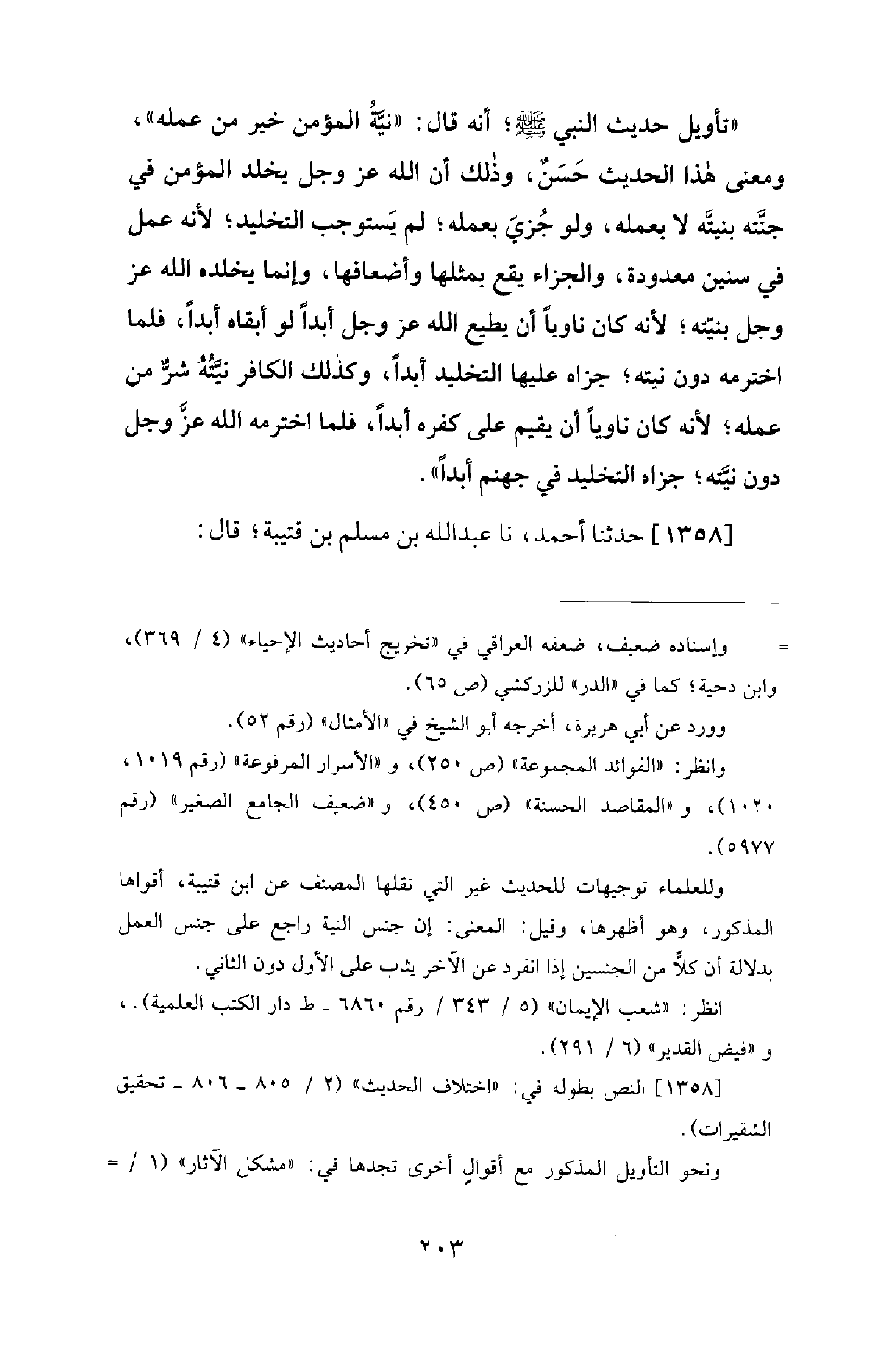 1358 - حَدَّثَنَا أَحْمَدُ، نَا عَبْدُ اللهِ بْنُ مُسْلِمِ بْنِ قُتَيْبَةَ؛ قَالَ: -[204]- مَعْنَى قَوْلِ النَّبِيِّ صَلَّى اللَّهُ عَلَيْهِ وَسَلَّمَ: «اكْلَفُوا مِنَ الْأَعْمَالِ مَا تُطِيقُونَ؛ فَإِنَّ اللهَ عَزَّ وَجَلَّ لا يَمَلُّ حَتَّى تَمَلُّوا» . وَتَأْوِيلُهُ: أَنَّ اللهَ عَزَّ وَجَلَّ لا يَمَلُّ إِذَا مَلِلْتُمْ، وَمِثَالُ هَذَا الْكَلامِ: قَوْلُكَ: هَذَا الْفَرَسُ لا يَفْتُرُ حَتَّى تَفْتُرَ الْخَيْلُ، يُرِيدُ أَنَّهُ لا يَفْتُرُ إِذَا فَتَرَتْ، وَلَوْ كَانَ هَذَا الْمُرَادُ مَا كَانَ لَهُ فَضْلٌ عَلَيْهَا؛ لِأَنَّهُ يَفْتُرُ مَعَهَا، فَأَيَّةُ فَضِيلَةٍ لَهُ؟ وَإِنَّمَا يُرِيدُ لا يَفْتُرُ إِذَا فَتَرَتْ، وَكَذَلِكَ تَقُولُ فِي الرَّجُلِ الْبَلِيغِ فِي كَلامِهِ وَالْمِكْثَارِ: فُلانٌ لا يَنْقَطِعُ حَتَّى تَنْقَطِعَ خُصُومُهُ، يُرِيدُ لا يَنْقَطِعُ إِذَا انْقَطَعُوا، وَلَوْ أَرَادَ أنه يَنْقَطِعُ إِذَا انْقَطَعُوا؛ لَمْ يَكُنْ لَهُ فِي هَذَا -[205]- الْقَوْلِ فَضْلٌ عَلَى غَيْرِهِ. وَقَدْ جَاءَ مِثْلُ هَذَا فِي الشِّعْرِ الْمَنْسُوبِ إِلَى أُخْتِ تَأَبَّطَ شَرًّا، وَيُقَالُ: إِنَّهُ لِخَلَفٍ الْأَحْمَرِ: