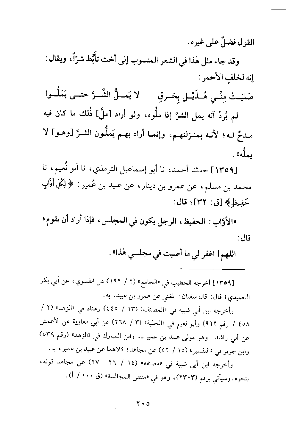1359 - حَدَّثَنَا أَحْمَدُ، نَا أَبُو إِسْمَاعِيلَ التِّرْمِذِيُّ، نَا أَبُو نُعَيْمٍ، نَا مُحَمَّدُ بْنُ مُسْلِمٍ، عَنْ عَمْرِو بْنِ دِينَارٍ، عَنْ عُبَيْدِ بْنِ عُمَيْرٍ: {لِكُلِّ أَوَّابٍ حفيظ} [ق: 32] ؛ قَالَ: الْأَوَّابُ الْحَفِيظُ: الرَّجُلُ يَكُونُ فِي الْمَجْلِسِ، فَإِذَا أَرَادَ أَنْ يَقُومَ؛ قَالَ: اللهُمَّ اغْفِرْ لِي مَا أَصَبْتُ فِي مَجْلِسِي هَذَا.