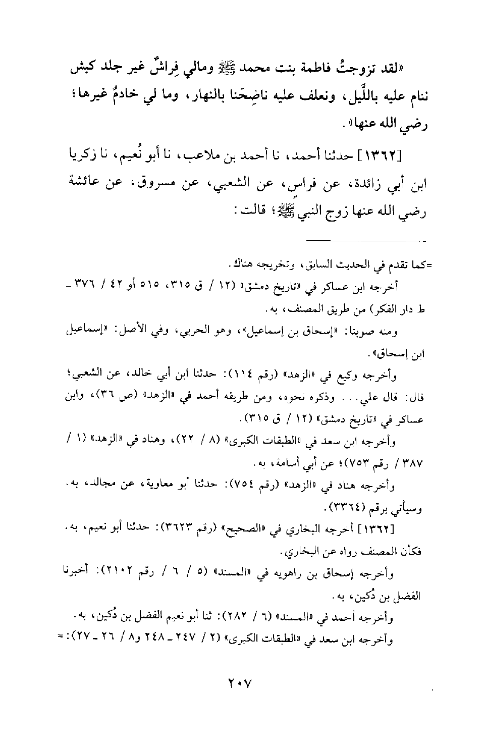 1362 - حَدَّثَنَا أَحْمَدُ، نَا أَحْمَدُ بْنُ مُلاعِبٍ، نَا أَبُو نُعَيْمٍ، نَا زَكَرِيَّا بْنُ أَبِي زَائِدَةَ، عَنْ فِرَاسٍ، عَنِ الشَّعْبِيِّ، عَنْ مَسْرُوقٍ، عَنْ عَائِشَةَ رَضِيَ اللهُ عَنْهَا زَوْجِ النَّبِيِّ صَلَّى اللَّهُ عَلَيْهِ وَسَلَّمَ؛ قَالَتْ: -[209]- أَقْبَلَتْ فَاطِمَةُ رَضِيَ اللهُ عَنْهَا تَمْشِي كَأَنَّ مِشْيَتَهَا مِشْيَةُ رَسُولِ اللهِ صَلَّى اللَّهُ عَلَيْهِ وَسَلَّمَ، فَقَالَ النَّبِيُّ صَلَّى اللَّهُ عَلَيْهِ وَسَلَّمَ: «مَرْحَبًا بَابْنَتِي» . فَأَقْعَدَهَا عَنْ يَمِينِهِ، ثُمَّ أَسَرَّ إِلَيْهَا حَدِيثًا فَبَكَتْ، ثُمَّ أَسَرَّ إِلَيْهَا حديثا فضحكت؛ قلت: مَا رَأَيْتُ كَالْيَوْمِ ضَحِكًا أَقْرَبَ مِنْ بُكَاءٍ، فَسَأَلْتُهَا: مَا قَالَ لَكِ؟ فَقَالَتْ: مَا كُنْتُ لِأُفْشِيَ سِرَّ رَسُولِ اللهِ صَلَّى اللَّهُ عَلَيْهِ وَسَلَّمَ. فَلَمَّا مَاتَ النَّبِيُّ صَلَّى اللَّهُ عَلَيْهِ وَسَلَّمَ سَأَلْتُهَا عَنْ ذَلِكَ؛ فَقَالَتْ: إِنَّهُ أَسَرَّ إِلَيَّ «أَنَّ جِبْرِيلَ عَلَيْهِ السَّلامُ كَانَ يُعَارِضُنِي بِالْقُرْآنِ فِي كُلِّ سَنَةٍ مَرَّةً، وَإِنَّهُ عَارَضَنِي الْعَامَ مَرَّتَيْنِ، وَلا أَرَانِي إِلَّا أَجَلِي قَدْ حَضَرَ، وَاعْلَمِي أَنَّكِ أَوَّلُ أَهْلِي لُحُوقًا بِي» ، فَبَكَيْتُ لِذَلِكَ؛ فَقَالَ: «وَمَا يُبْكِيكِ؟ أَمَا تَرْضَيْنَ أَنْ تَكُونِي سَيِّدَةَ نِسَاءِ هَذِهِ الْأُمَّةِ أَوْ سَيِّدَةَ نِسَاءِ الْعَالَمِينَ؟» قال: فَضَحِكْتُ لِذَلِكَ