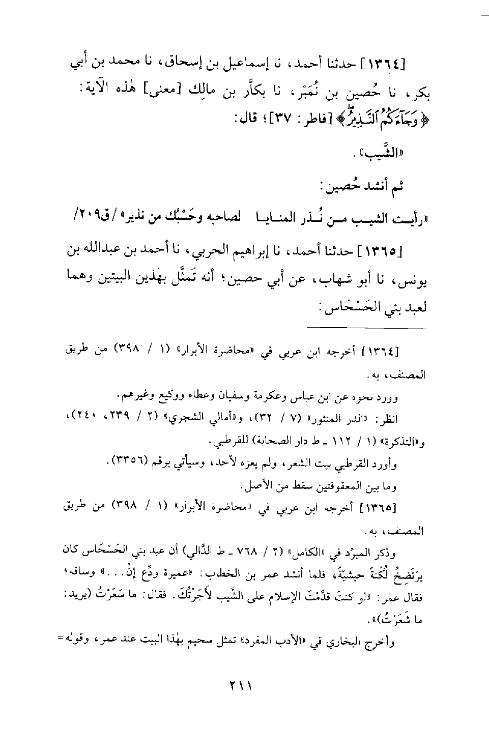 1365 - حَدَّثَنَا أَحْمَدُ، نَا إِبْرَاهِيمُ الْحَرْبِيُّ، نَا أَحْمَدُ بْنُ عَبْدِ اللهِ بْنِ يُونُسَ، نَا أَبُو شِهَابٍ، عَنْ أَبِي حُصَيْنٍ؛ أَنَّهُ تَمثَّلَ بِهَذَيْنِ الْبَيْتَيْنِ وَهُمَا لِعَبْدِ بَنِي الْحَسْحَاسِ -[212]-: