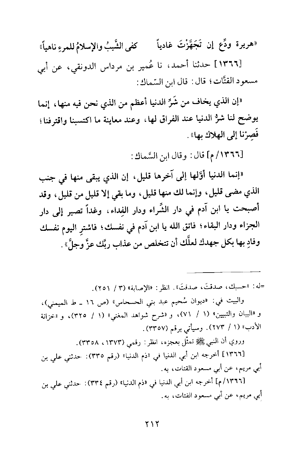 1366 - حَدَّثَنَا أَحْمَدُ، نَا عُمَيْرُ بْنُ مِرْدَاسٍ الدُّونَقِيُّ، عَنْ أَبِي مَسْعُودٍ الْقَتَّاتِ؛ قَالَ: قَالَ ابْنُ السَّمَّاكِ: إِنَّ الَّذِي يُخَافُ مِنْ شَرِّ الدُّنْيَا أَعْظَمُ مِنَ الَّذِي نَحْنُ فِيهِ مِنْهَا، إِنَّمَا يُوضَحُ لَنَا شَرُّ الدُّنْيَا عِنْدَ الْفِرَاقِ لَهَا، وَعِنْدَ مُعَايَنَةِ مَا اكْتَسَبْنَا وَاقْتَرَفْنَا؛ فَصِرْنَا إِلَى الْهَلاكِ بِهَا.