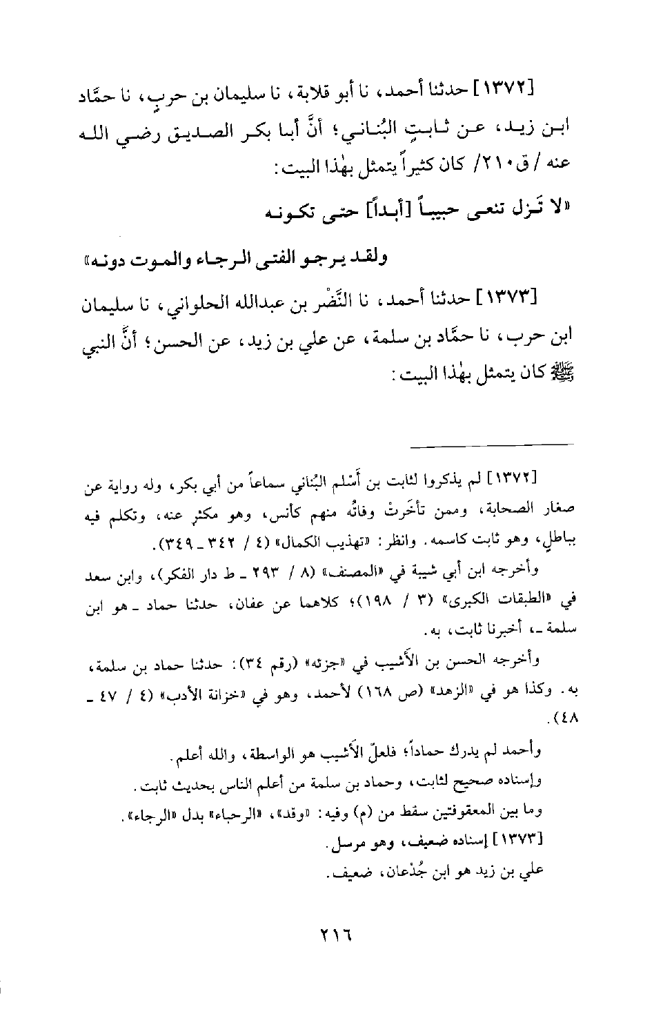 1372 - حَدَّثَنَا أَحْمَدُ، نَا أَبُو قِلابَةَ، نَا سُلَيْمَانُ بْنُ حَرْبٍ، نَا حَمَّادُ بْنُ زَيْدٍ، عَنْ ثَابِتٍ الْبُنَانِيِّ؛ أَنَّ أَبَا بَكْرٍ الصِّدِّيقَ رَضِيَ اللهُ عَنْهُ كَانَ كَثِيرًا يَتَمَثَّلُ بِهَذَا الْبَيْتِ: