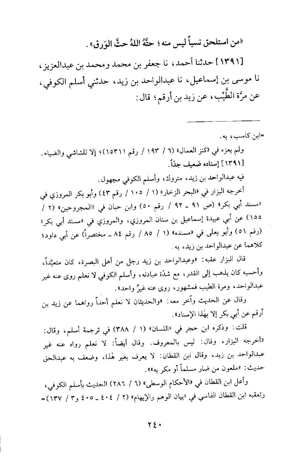 1391 - حَدَّثَنَا أَحْمَدُ، نَا جَعْفَرُ بْنُ مُحَمَّدٍ وَمُحَمَّدُ بْنُ عَبْدِ الْعَزِيزِ، نَا مُوسَى بْنُ إِسْمَاعِيلَ، نَا عَبْدُ الْوَاحِدِ بْنُ زَيْدٍ، حَدَّثَنِي أَسْلَمُ الْكُوفِيُّ، عَنْ مُرَّةَ الطَّيِّبِ، عَنْ زَيْدِ بْنِ أَرْقَمَ؛ قَالَ: -[241]- كُنَّا عِنْدَ أَبِي بَكْرٍ الصِّدِّيقِ رَضِيَ اللهُ عَنْهُ، فَأَتَاهُ غُلامُهُ بِطَعَامٍ، فَأَهْوَى إِلَى لُقْمَةٍ فَأَكَلَهَا، فَقَالَ لَهُ الْغُلامُ: لَمْ تَسْأَلْنِي عَنْهُ: مِنْ أَيْنَ اكْتَسَبْتُهُ! فَأَخْبَرَهُ، فَأَدْخَلَ أُصْبُعَهُ فِي حَلْقِهِ، فَلَمْ يَزَلْ يَتَقَيَّأُ حَتَّى ظَنَنَّا أَنَّ نَفْسَهُ سَتَخْرُجُ، ثُمَّ قَالَ: سَمِعْتُ حَبِيبِي رَسُولَ اللهِ صَلَّى اللَّهُ عَلَيْهِ وَسَلَّمَ؛ يَقُولُ «إيما لَحْمٍ نَبَتَ مِنْ حَرَامٍ، أَوْ جَسَدٍ غُذِّيَ بِحَرَامٍ؛ فَالنَّارُ أَوْلَى بِهِ»