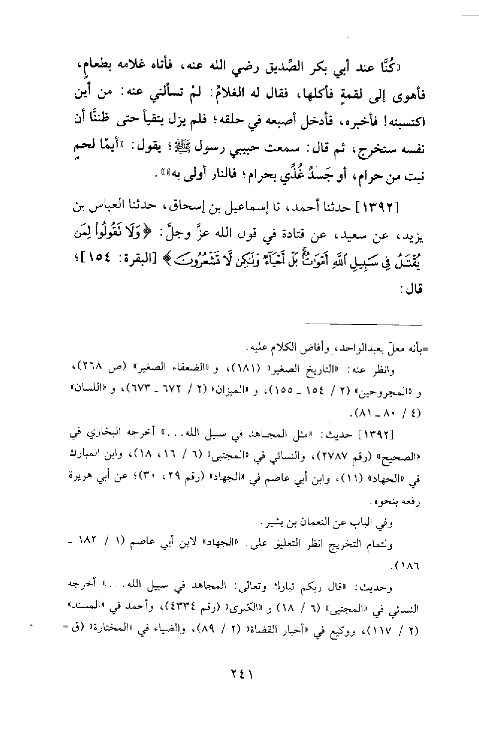1392 - حَدَّثَنَا أَحْمَدُ، نَا إِسْمَاعِيلُ بْنُ إِسْحَاقَ، حَدَّثَنَا الْعَبَّاسُ بْنُ يَزِيدَ، عَنْ سَعِيدٍ، عَنْ قَتَادَةَ فِي قَوْلِ اللهِ عَزَّ وَجَلَّ: (وَلاَ تَقُولُوا لِمَنْ يُقْتَلُ فِي سَبِيلِ اللهِ أَمْوَاتٌ بَلْ أَحْيآءٌ وَلكِن لَّا تَشْعُرُونَ (154)) [البقرة: 154] ؛ قَالَ: -[242]- إِنَّ أَرْوَاحَ الشُّهَدَاءِ فِي طَيْرٍ بِيضٍ، يَأْكُلْنَ مِنْ ثَمَرِ الْجَنَّةِ، وَإِنَّ مَسَاكِنَهُمُ السِّدْرَةَ، وَإِنَّ لِلْمُجَاهِدِ فِي سَبِيلِ اللهِ ثَلاثَ خِصَالٍ: مَنْ قُتِلَ مِنْهُمْ فِي سَبِيلِ اللهِ صَارَ حَيًّا مَرْزُوقًا، وَمَنْ غَلَبَ آتاه الله أجر عَظِيمًا، وَمَنْ مَاتَ رَزَقَهُ اللهُ رِزْقًا حَسَنًا. قَالَ إِسْمَاعِيلُ: وَمِنْهُ حَدِيثُ النَّبِيِّ صَلَّى اللَّهُ عَلَيْهِ وَسَلَّمَ: «مَثَلُ الْمُجَاهِدِ فِي سَبِيلِ لله كَمَثَلِ الْقَانِتِ الصَّائِمِ الَّذِي لا يَفْتُرُ -[243]- مِنْ صَلَوَاتِهِ وَلا صِيَامِهِ حَتَّى يَرْجِعَ مَتَى مَا رَجَعَ» ، وَقَالَ صَلَّى اللَّهُ عَلَيْهِ وَسَلَّمَ: «قَالَ رَبُّكُمْ تَبَارَكَ وَتَعَالَى: الْمُجَاهِدُ فِي سَبِيلِ اللهِ عَلَيَّ ضَامِنٌ إِنْ قَبَضْتُهُ؛ أَدْخَلْتُهُ الْجَنَّةَ، وَإِنْ رَجَعْتُهُ؛ رَجَعْتُهُ بِأَجْرٍ وَغَنِيمَةٍ» .