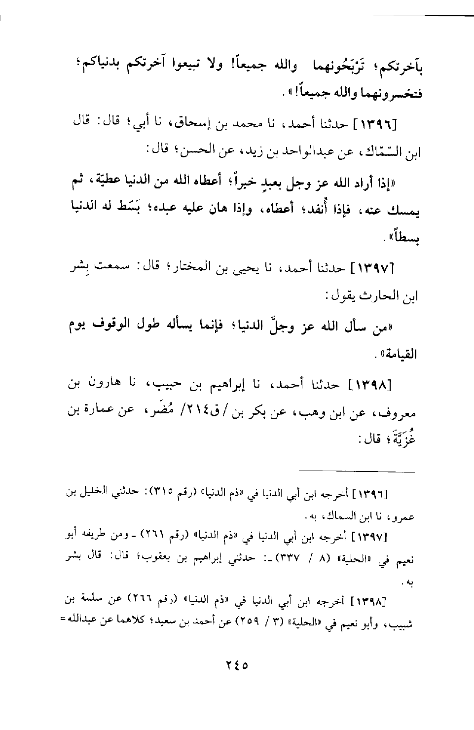 1397 - حَدَّثَنَا أَحْمَدُ، نَا يَحْيَى بْنُ الْمُخْتَارِ؛ قَالَ: سَمِعْتُ بِشْرَ بْنَ الْحَارِثِ يَقُولُ: مَنْ سَأَلَ اللهَ عَزَّ وَجَلَّ الدُّنْيَا؛ فَإِنَّمَا يَسْأَلُهُ طُولَ الْوُقُوفِ يَوْمَ الْقِيَامَةِ.