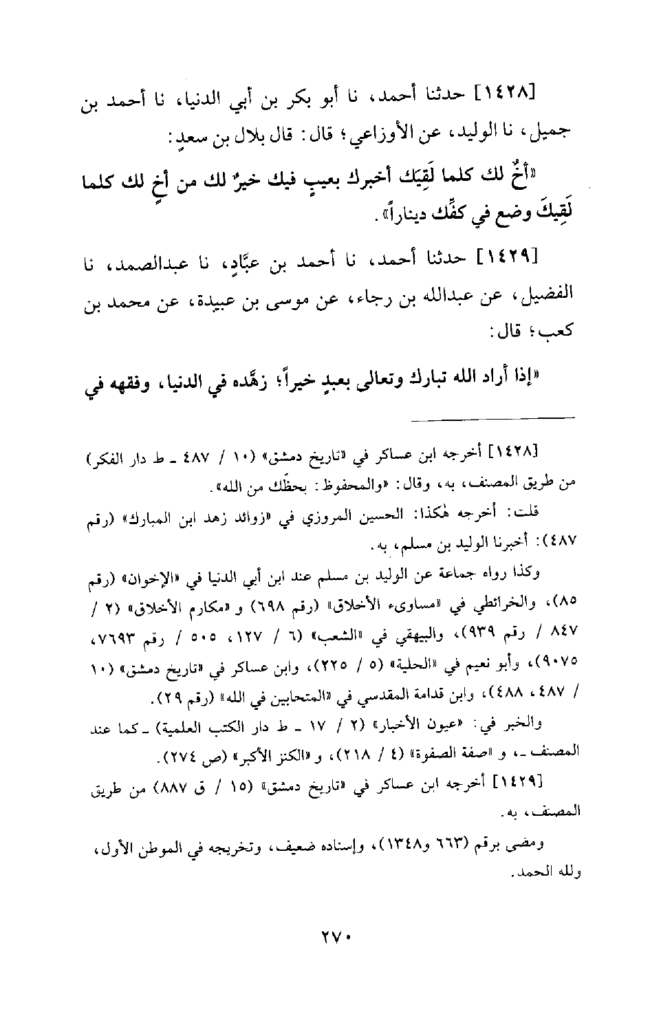 1428 - حَدَّثَنَا أَحْمَدُ، نَا أَبُو بَكْرِ بْنُ أَبِي الدَّنْيَا، نَا أَحْمَدُ بْنُ جَمِيلٍ، نَا الْوَلِيدُ، عَنِ الْأَوْزَاعِيِّ؛ قَالَ: قَالَ بِلالُ بْنُ سَعْدٍ: أَخٌ لَكَ كُلَّمَا لَقِيَكَ أَخْبَرَكَ بِعَيْبٍ فِيكَ خَيْرٌ لَكَ مِنْ أَخٍ لَكَ كُلَّمَا لَقِيَكَ وَضَعَ فِي كَفِّكَ دِينَارًا.