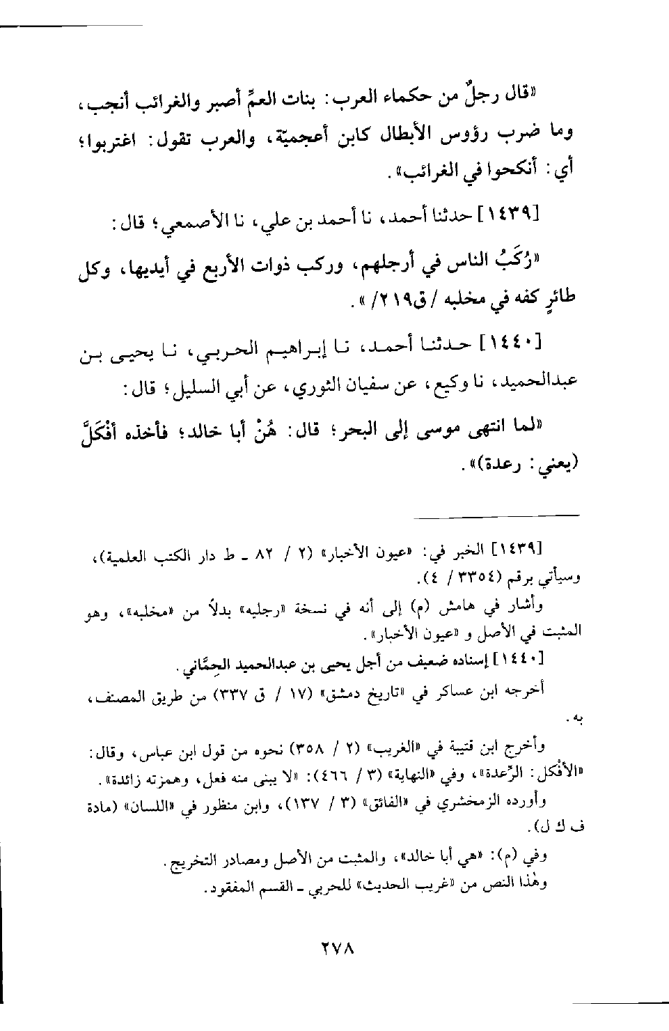 1439 - حَدَّثَنَا أَحْمَدُ، نَا أَحْمَدُ بْنُ عَلِيٍّ، نَا الْأَصْمَعِيُّ؛ قَالَ: رُكَبُ النَّاسِ فِي أَرْجُلِهِمْ، وَرُكَبُ ذَوَاتِ الْأَرْبَعِ فِي أَيْدِيهَا، وَكُلُّ طَائِرٍ كَفُّهُ فِي مَخْلَبِهِ.