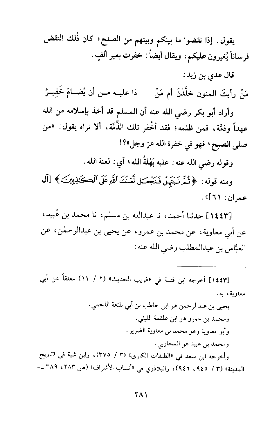 1443 - حَدَّثَنَا أَحْمَدُ، نَا عَبْدُ اللهِ بْنُ مُسْلِمٍ، نَا مُحَمَّدُ بْنُ عُبَيْدٍ، عَنْ أَبِي مُعَاوِيَةَ، عَنْ مُحَمَّدِ بْنِ عَمْرٍو، عَنْ يَحْيَى بْنِ عَبْدِ الرَّحْمَنِ، عَنِ الْعَبَّاسِ بْنِ عَبْدِ الْمُطَّلِبِ رَضِيَ اللهُ عَنْهُ: -[282]- أَنَّهُ رَأَى عُمَرَ بْنَ الْخَطَّابِ فِي النَّوْمِ، فَسَأَلَهُ عَنْ حَالِهِ، فَقَالَ: لَوْلا أَنِّي صَادَفْتُ رَبًّا رَحِيمًا؛ لَكَادَ عَرْشِي يُثَلُّ. قَالَ أَبُو مُحَمَّدٍ: يَعْنِي لَوْلا أَنِّي لَقِيتُ رَبًّا رَحِيمًا، فَتَجَاوَزَ عَنِّي وَتَغَمَّدَنِي بِفَضْلِهِ وَرَحْمَتِهِ؛ لَكِدْتُ أَنْ أَهْلَكَ، وَقَوْلُهُ: ثُلَّ عَرْشِي: هَذَا مَثَلٌ يُضْرَبُ لِلرَّئِيسِ إِذَا زَالَ أَوْ هَلَكَ، وَالْأَصْلُ فِي هَذَا أَنَّ الْأَسِرَّةَ كَانَتْ لِلْمُلُوكِ، وَإِذَا ثل عشر الْمَلِكِ - يَعْنِي: سَرِيرَهُ -؛ فَقَدْ ذَهَبَ عِزُّهُ. وَيُقَالُ أَيْضًا: هُوَ الْبَيْتُ مِنَ الْعِيدَانِ يُنْصَبُ وَيُظَلَّلُ، وَجَمْعُهَا -[283]- عُرُوشٌ، وَإِذَا كُسِرَ عُرُوشُ الرَّجُلِ؛ فَقَدْ ذَهَبَ عِزُّهُ.