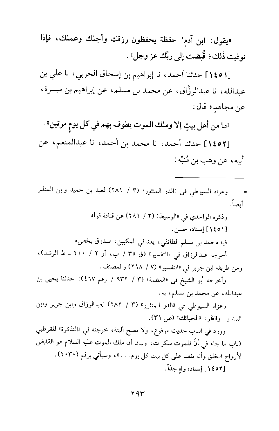 1451 - حَدَّثَنَا أَحْمَدُ، نَا إِبْرَاهِيمُ بْنُ إِسْحَاقَ الْحَرْبِيُّ نَا عَلِيُّ بْنُ عَبْدِ اللهِ، نَا عَبْدُ الرَّزَّاقِ، عَنْ مُحَمَّدِ بْنِ مُسْلِمٍ، عن إبرهيم بْنِ مَيْسَرَةَ، عَنْ مُجَاهِدٍ؛ قَالَ: مَا مِنْ أَهْلِ بَيْتٍ إِلَّا وَمَلَكُ الْمَوْتِ يَطُوفُ بِهِمْ فِي كُلِّ يَوْمٍ مَرَّتَيْنِ