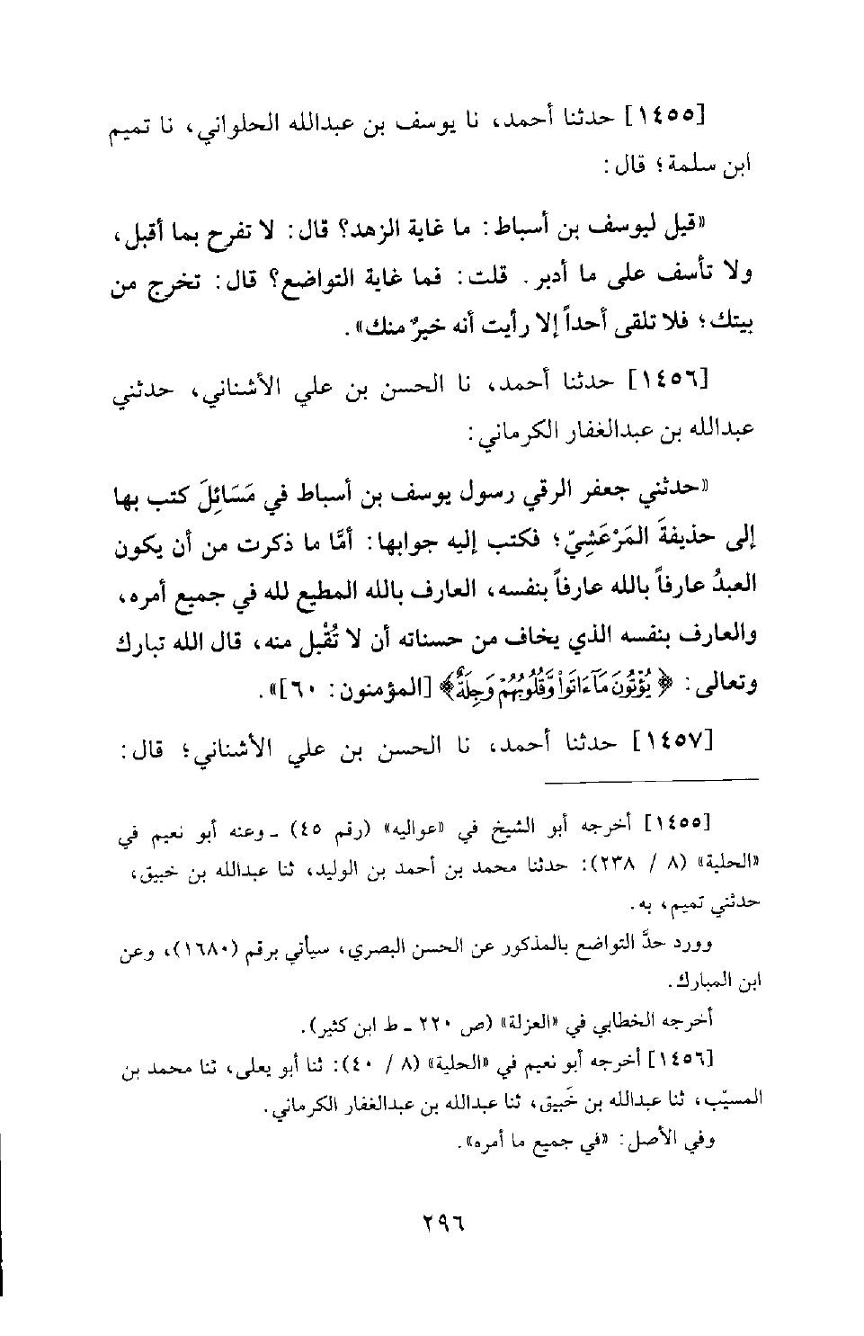 1455 - حَدَّثَنَا أَحْمَدُ، نَا يُوسُفُ بْنُ عَبْدِ اللهِ الْحُلْوَانِيُّ، نَا تَمِيمُ بْنُ سَلَمَةَ؛ قَالَ: قِيلَ لِيُوسُفَ بْنِ أَسْبَاطٍ: مَا غَايَةُ الزُّهْدِ؟ قَالَ: لا تَفْرَحْ بِمَا أَقْبَلْ، وَلا تَأْسَفْ عَلَى مَا أَدْبَرْ. قُلْتُ: فَمَا غَايَةُ التَّوَاضُعِ؟ قَالَ: تَخْرُجُ مِنْ بَيْتِكَ، فَلا تَلْقَى أَحَدًا إِلَّا رَأَيْتَ أَنَّهُ خَيْرٌ مِنْكَ.