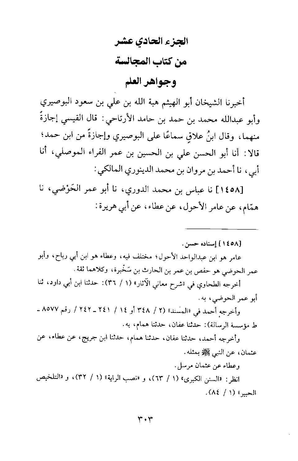 1458 - نَا عَبَّاسُ بْنُ مُحَمَّدٍ الدُّورِيُّ، نَا أَبُو عُمَرَ الْحَوْضِيُّ، نَا هَمَّامٌ، عَنْ عَامِرٍ الْأَحْوَلِ، عَنْ عَطَاءٍ، عَنْ أَبِي هُرَيْرَةَ. -[304]- أَنَّ رَسُولَ اللهِ صَلَّى اللَّهُ عَلَيْهِ وَسَلَّمَ تَوَضَّأَ؛ فَتَمَضْمَضَ ثَلاثًا، وَاسْتَنْشَقَ ثَلاثًا، وَغَسَلَ وَجْهَهُ ثَلاثًا، وَمَسَحَ بِرَأْسِهِ وَوَضَّأَ قَدَمَيْهِ