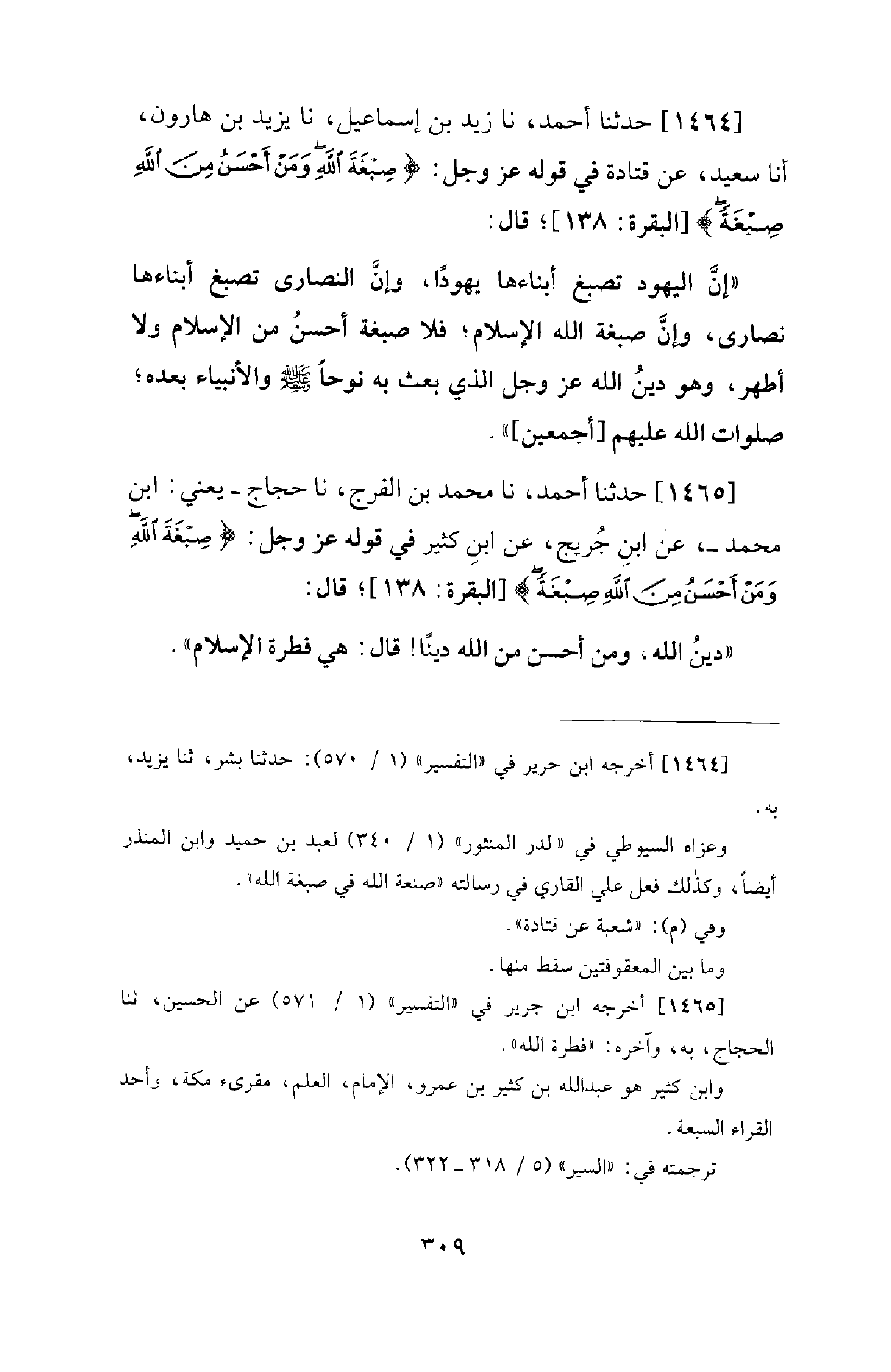 1465 - حَدَّثَنَا أَحْمَدُ، نَا مُحَمَّدُ بْنُ الْفَرَجِ، نَا حَجَّاجٌ - يَعْنِي: ابْنَ مُحَمَّدٍ -، عَنِ ابْنِ جُرَيْجٍ، عَنِ ابْنِ كَثِيرٍ فِي قَوْلِهِ عَزَّ وَجَلَّ: {صِبْغَةَ اللهِ وَمَنْ أَحْسَنُ من الله صبغة} [البقرة: 138] ؛ قَالَ: دِينُ اللهِ، وَمَنْ أَحْسَنُ مِنَ اللهِ دِينًا! قَالَ: هِيَ فِطْرَةُ الْإِسْلامِ.