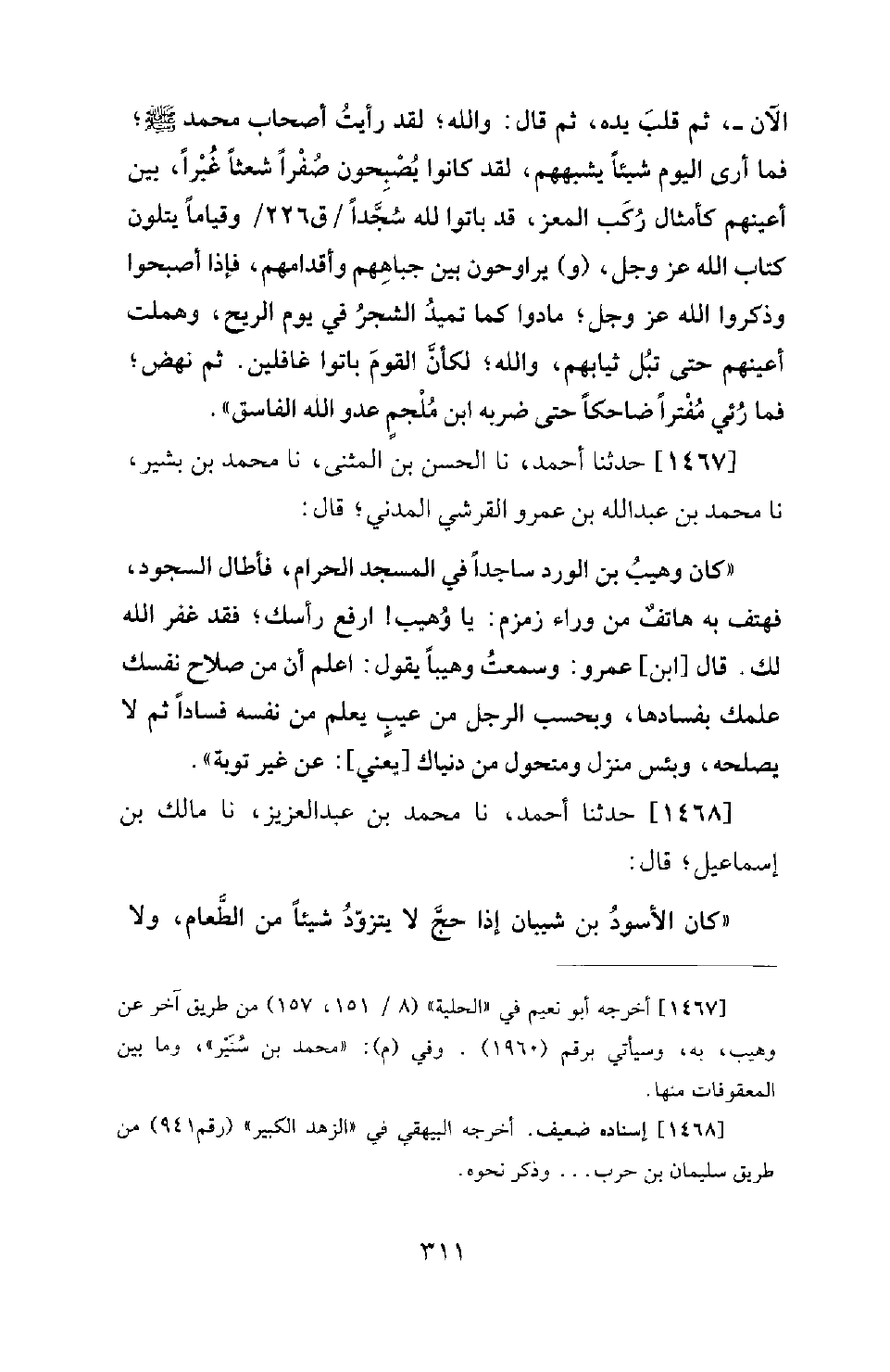 1467 - حَدَّثَنَا أَحْمَدُ، نَا الْحَسَنُ بْنُ الْمُثَنَّى، نَا مُحَمَّدُ بْنُ بَشِيرٍ، نَا مُحَمَّدُ بْنُ عَبْدِ اللهِ بْنِ عَمْرٍو الْقُرَشِيُّ الْمَدَنِيُّ؛ قَالَ: كَانَ وُهَيْبُ بْنُ الْوَرْدِ سَاجِدًا فِي الْمَسْجِدِ الْحَرَامِ، فَأَطَالَ السُّجُودَ، فَهَتَفَ بِهِ هَاتِفٌ مِنْ وَرَاءِ زَمْزَمَ: يَا وُهَيْبُ! ارْفَعْ رَأْسَكَ؛ فَقَدْ غَفَرَ اللهُ لَكَ. قَالَ ابْنُ عَمْرٍو: وَسَمِعْتُ وُهَيْبًا يَقُولُ: اعْلَمْ أَنَّ مِنْ صلاح نفسك عِلْمَكَ بِفَسَادِهَا، وَبِحَسْبِ الرَّجُلِ مِنْ عَيْبٍ يَعْلَمُ مِنْ نَفْسِهِ فَسَادًا ثُمَّ لا يُصْلِحُهُ، وَبِئْسَ مَنْزِلٌ وَمُتَحَوَّلٌ مِنْ دُنْيَاكَ - يَعْنِي: - عَنْ غَيْرِ تَوْبَةٍ.