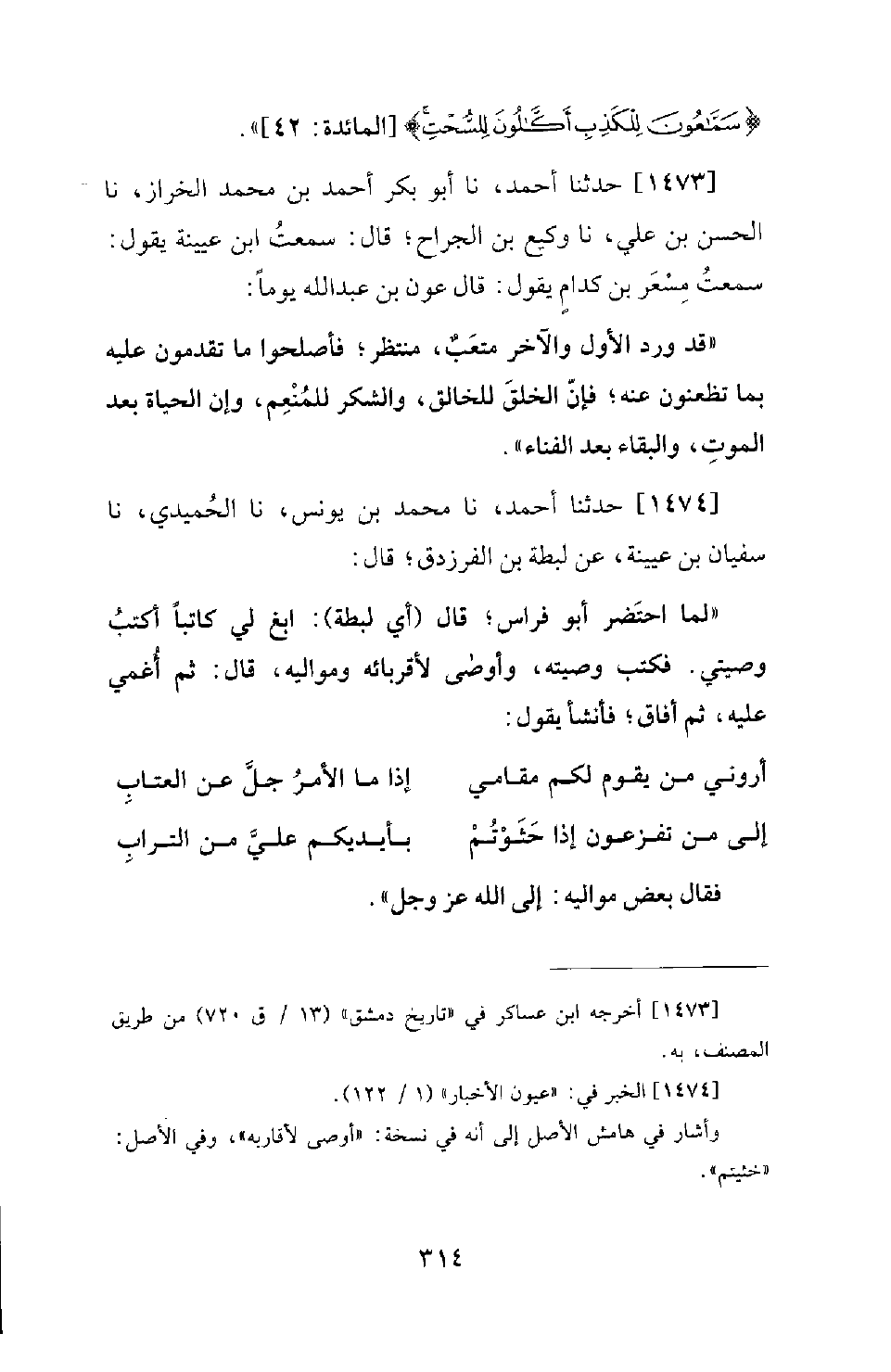 1474 - حَدَّثَنَا أَحْمَدُ، نَا مُحَمَّدُ بْنُ يُونُسَ، نَا الْحُمَيْدِيُّ، نَا سُفْيَانُ بْنُ عُيَيْنَةَ، عَنْ لَبْطَةَ بْنِ الْفَرَزْدَقِ؛ قَالَ: لَمَّا احْتَضَرَ أَبُو فِرَاسٍ؛ قَالَ: أَيْ لبطة! ابغ لي كتابا أَكْتُبُ وَصِيَّتِي. فَكَتَبَ وَصِيَّتَهُ، وَأَوْصَى لِأَقْرِبَائِهِ وَمَوَالِيهِ، قَالَ: ثُمَّ أُغْمِيَ عَلَيْهِ، ثُمَّ أَفَاقَ؛ فأنشا يَقُولُ: