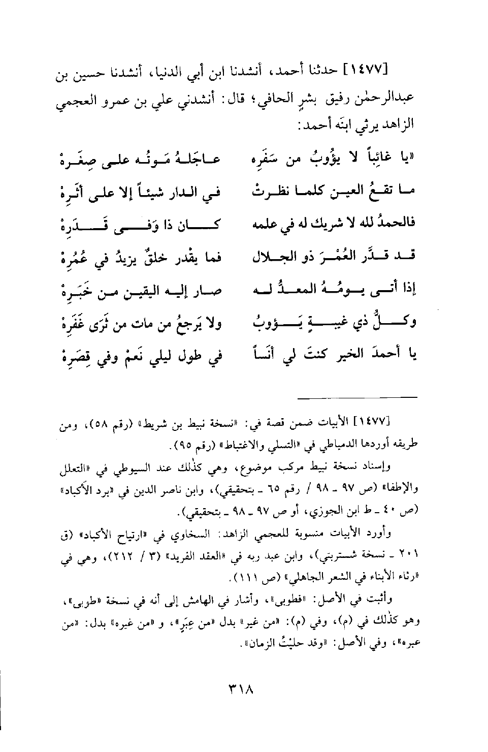 1477 - حَدَّثَنَا أَحْمَدُ، أَنْشَدَنَا ابْنُ أَبِي الدُّنْيَا، أَنْشَدَنَا حُسَيْنُ بْنُ عَبْدِ الرَّحْمَنِ رَفِيقُ بِشْرٍ الْحَافِي؛ قَالَ: أَنْشَدَنِي عَلِيُّ بْنُ عَمْرٍو الْعَجَمِيُّ الزَّاهِدُ يَرْثِي ابْنَهُ أَحْمَدَ: