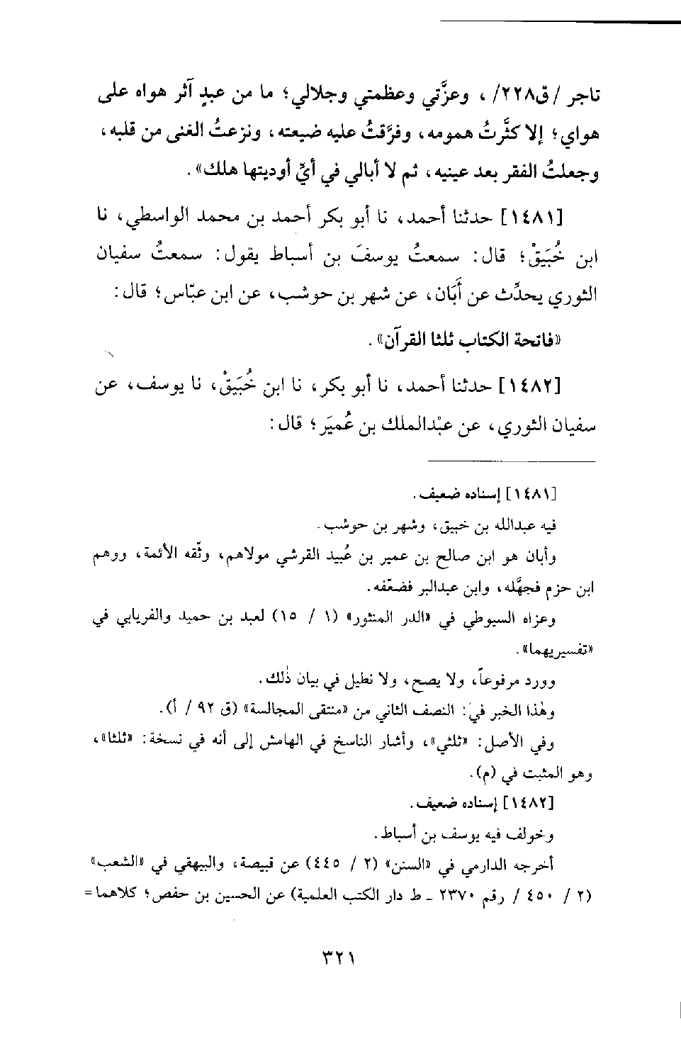 1481 - حَدَّثَنَا أَحْمَدُ، نَا أَبُو بَكْرٍ أَحْمَدُ بْنُ مُحَمَّدٍ الْوَاسِطِيُّ، نَا ابْنُ خُبَيْقٍ؛ قَالَ: سَمِعْتُ يُوسُفَ بْنَ أَسْبَاطٍ يَقُولُ: سَمِعْتُ سُفْيَانَ الثَّوْرِيَّ يُحَدِّثُ عَنْ أَبَانَ، عَنْ شَهْرِ بْنِ حَوْشَبٍ، عَنِ ابْنِ عَبَّاسٍ؛ قَالَ: فَاتِحَةُ الْكِتَابِ ثُلُثَا الْقُرْآنِ
