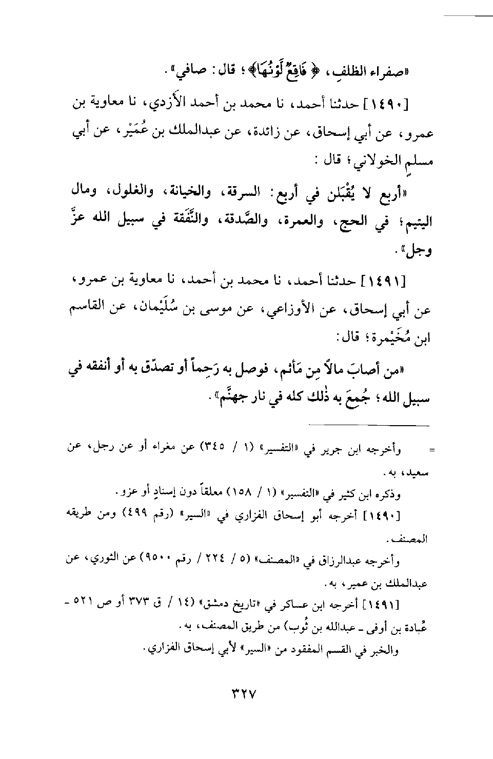 1490 - حَدَّثَنَا أَحْمَدُ، نَا مُحَمَّدُ بْنُ أَحْمَدَ الْأَزْدِيُّ، نَا مُعَاوِيَةُ بْنُ عَمْرٍو، عَنْ أَبِي إِسْحَاقَ، عَنْ زَائِدَةَ، عَنْ عَبْدِ الْمَلِكِ بْنِ عُمَيْرٍ، عَنْ أَبِي مُسْلِمٍ الْخَوَلانِيِّ؛ قَالَ: أَرْبَعٌ لا يُقْبَلْنَ فِي أَرْبَعٍ: السَّرِقَةُ، وَالْخِيَانَةُ، وَالْغُلُولُ، وَمَالُ الْيَتِيمِ؛ فِي الْحَجِّ، وَالْعُمْرَةِ، وَالصَّدَقَةِ، وَالنَّفَقَةِ فِي سَبِيلِ اللهِ عَزَّ وَجَلَّ.