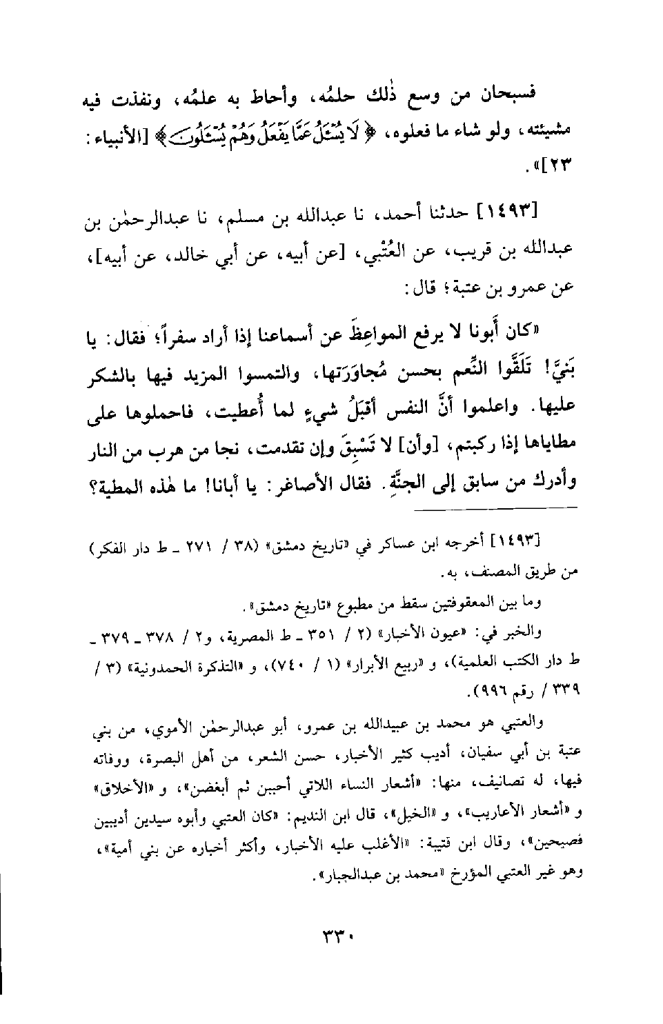 1493 - حَدَّثَنَا أَحْمَدُ، نَا عَبْدُ اللهِ بْنُ مُسْلِمٍ، نَا عَبْدُ الرَّحْمَنِ بْنُ عَبْدِ اللهِ بْنِ قَرِيبٍ، عَنِ الْعُتْبِيِّ، عَنْ أَبِيهِ، عَنْ أَبِي خَالِدٍ، عَنْ أَبِيهِ؛ عَنْ عَمْرِو بْنِ عُتْبَةَ؛ قَالَ: كَانَ أَبُونَا لا يَرْفَعُ الْمَوَاعِظَ عَنْ أَسْمَاعِنَا إِذَا أَرَادَ سَفَرًا؛ فَقَالَ: يَا بَنِيَّ! تَلَقَّوُا النِّعَمَ بِحُسْنِ مُجَاوَرَتِهَا وَالْتَمِسُوا الْمَزِيدَ فِيهَا بِالشُّكْرِ عَلَيْهَا. وَاعْلَمُوا أَنَّ النَّفْسَ أَقَبَلُ شَيْءٍ لِمَا أُعْطِيَتْ، فَاحْمِلُوهَا عَلَى مَطَايَاهَا إِذَا رَكِبْتُمْ، وَأَنْ لا تَسْبِقَ وَإِنْ تَقَدَّمْتَ، نَجَا مَنْ هَرَبَ مِنَ النَّارِ، وَأَدْرَكَ مَنْ سَابَقَ إِلَى الْجَنَّةِ. فَقَالَ الْأَصَاغِرُ: يَا أَبَانَا! مَا هَذِهِ الْمَطِيَّةُ؟ -[331]- قَالَ: التَّوْبَةُ يَا بَنِيَّ.