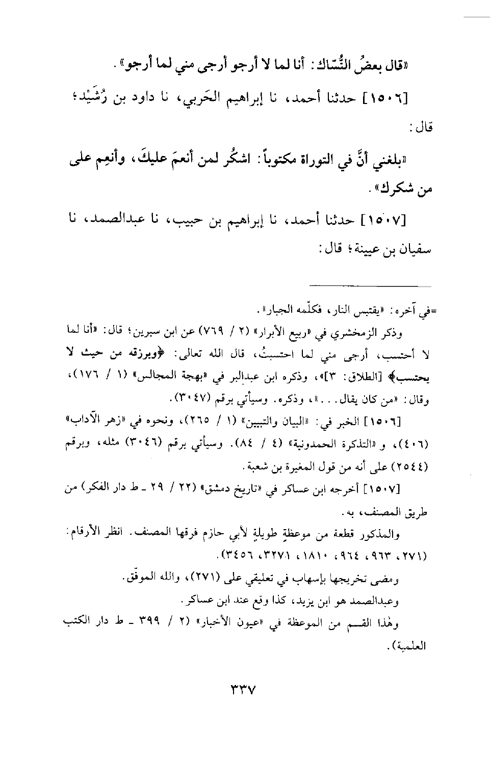 1506 - حَدَّثَنَا أَحْمَدُ، نَا إِبْرَاهِيمُ الْحَرْبِيُّ، نَا دَاوُدُ بْنُ رُشَيْدٍ؛ قَالَ: بَلَغَنِي أَنَّ فِي التَّوْرَاةِ مَكْتُوبًا: اشْكُرْ لِمَنْ أَنْعَمَ عَلَيْكَ، وَأَنْعِمْ عَلَى مَنْ شَكَرَكَ.