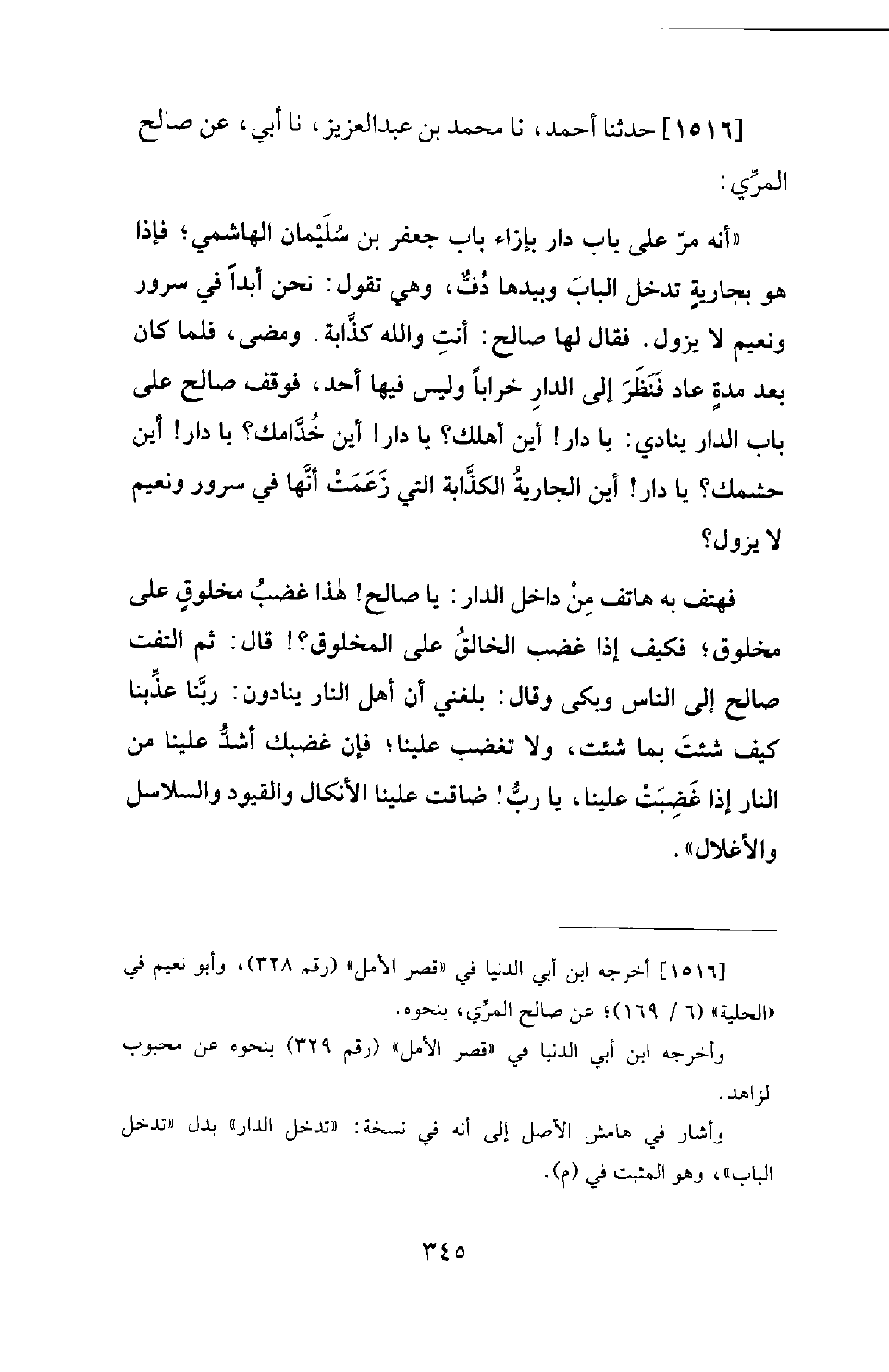 1516 - حَدَّثَنَا أَحْمَدُ، نَا مُحَمَّدُ بْنُ عَبْدِ الْعَزِيزِ، نَا أَبِي، عَنْ صَالِحٍ الْمُرِّيِّ: أَنَّهُ مَرَّ عَلَى بَابِ دَارٍ بِإِزَاءِ بَابِ جَعْفَرِ بْنِ سُلَيْمَانَ الْهَاشِمِيِّ؛ فَإِذَا هُوَ بِجَارِيَةٍ تَدْخُلُ الْبَابَ وَبِيَدِهَا دُفٌّ، وَهِيَ تَقُولُ: نَحْنُ أَبَدًا فِي سُرُورٍ وَنَعِيمٍ لا يَزُولُ. فَقَالَ لَهَا صَالِحٌ: أَنْتِ وَاللهِ كَذَّابَةٌ. وَمَضَى، فَلَمَّا كَانَ بَعْدَ مُدَّةٍ عَادَ فَنَظَرَ إِلَى الدَّارِ خَرَابًا وَلَيْسَ فِيهَا أَحَدٌ، فَوَقَفَ صَالِحٌ عَلَى بَابِ الدَّارِ يُنَادِي: يَا دَارُ! أَيْنَ أَهْلُكِ؟ يَا دَارُ! أَيْنَ خُدَّامُكِ؟ يَا دَارُ! أَيْنَ حَشَمُكِ؟ يَا دَارُ! أَيْنَ الْجَارِيَةُ الْكَذَّابَةُ الَّتِي زَعَمَتْ أَنَّهَا فِي سُرُورٍ وَنَعِيمٍ لا يَزُولُ؟ ! فَهَتَفَ بِهِ هَاتِفٌ مِنْ دَاخِلِ النار: يَا صَالِحُ! هَذَا غَضَبُ مَخْلُوقٍ عَلَى مَخْلُوقٍ؛ فَكَيْفَ إِذَا غَضِبَ الْخَالِقُ عَلَى الْمَخْلُوقِ؟ ! قَالَ: ثُمَّ الْتَفَتَ صَالِحٌ إِلَى النَّاسِ وَبَكَى وَقَالَ: بَلَغَنِي أَنَّ أَهْلَ النَّارِ يُنَادُونَ: رَبَّنَا عَذِّبْنَا كَيْفَ شِئْتَ بِمَا شِئْتَ، وَلا تَغْضَبْ عَلَيْنَا؛ فَإِنَّ غَضَبَكَ أَشَدُّ عَلَيْنَا مِنَ النَّارِ إِذَا غَضِبَتْ عَلَيْنَا، يَا رَبِّ! ضَاقَتْ عَلَيْنَا الأَنْكَالُ وَالْقُيُودُ وَالسَّلاسِلُ وَالأغْلالُ.