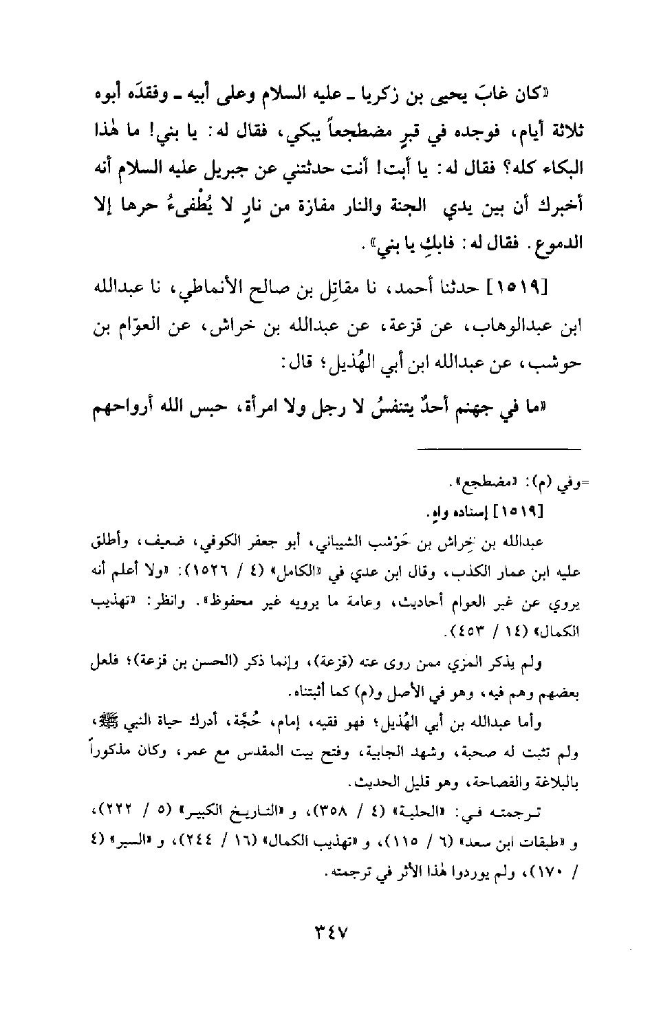 1519 - حَدَّثَنَا أَحْمَدُ، نَا مُقَاتِلُ بْنُ صَالِحٍ الأَنْمَاطِيُّ، نَا عَبْدُ اللهِ بْنُ عَبْدِ الْوَهَّابِ، عَنْ قَزْعَةَ، عَنْ عَبْدِ اللهِ بْنِ خِرَاشٍ، عَنِ الْعَوَّامِ بْنِ حَوْشَبٍ، عَنْ عَبْدِ اللهِ ابن أَبِي الْهُذَيْلِ؛ قَالَ: مَا فِي جَهَنَّمَ أَحَدٌ يَتَنَفَّسُ لا رَجُلٌ وَلا امْرَأَةٌ، حَبَسَ اللهُ أَرْوَاحَهُمْ -[348]- فِي أَجْوَافِهِمْ وَحَبَسَ أَنْفَاسَهُمْ فِي أَجْوَافِهِمْ؛ فَذَلِكَ أَشَدُّ عَلَيْهِمْ مِنْ جَهَنَّمَ وَمَا فِيهَا
