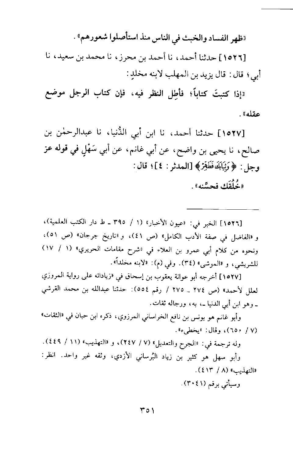 1526 - حَدَّثَنَا أَحْمَدُ، نَا أَحْمَدُ بْنُ مُحْرِزٍ، نَا مُحَمَّدُ بْنُ سَعِيدٍ، نَا أَبِي؛ قَالَ: قَالَ يَزِيدُ بْنُ الْمُهَلَّبِ لابْنِهِ مُخَلَّدٍ: إِذَا كَتَبْتَ كِتَابًا؛ فَأَطِلِ النَّظَرَ فِيهِ، فَإِنَّ كِتَابَ الرَّجُلِ مَوْضِعُ عَقْلِهِ.