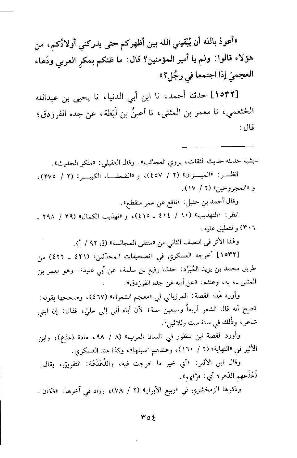 1532 - حَدَّثَنَا أَحْمَدُ، نَا ابْنُ أَبِي الدُّنْيَا، نَا يَحْيَى بْنُ عَبْدِ اللهِ الْخَثْعَمِيُّ، نَا مَعْمَرُ بْنُ الْمُثَنَّى، نَا أَعْيُنُ بْنُ لَبْطَةَ، عَنْ جَدِّهِ الْفَرَزْدَقِ؛ قَالَ: -[355]- دَخَلْتُ مَعَ أَبِي عَلَى عَلِيِّ بْنِ أَبِي طَالِبٍ رَضِيَ اللهُ عَنْهُ، فَسَلَّمَ عَلَيْهِ أَبِي، فَقَالَ لَهُ: مَنْ أَنْتَ؟ فَقَالَ: أَنَا غَالِبُ بْنُ صَعْصَعَةَ. فَقَالَ: ذُو الإِبِلِ الْكَثِيرَةِ؟ قَالَ: نَعَمْ. قَالَ: فَمَا صَنَعَتْ إِبِلُكَ؟ قَالَ: ذَعْذَعَتْهَا الْحُقُوقُ، وَأَذَابَتْهَا النَّوَائِبُ. فَقَالَ عَلِيٌّ: ذَلِكَ خَيْرُ سَبِيلِهَا. ثُمَّ قَالَ: مَنْ هَذَا الَّذِي مَعَكَ؟ قَالَ: ابْنِي. قَالَ: هُوَ شَاعِرٌ، وَإِنْ شِئْتَ أَنْشَدَكَ. فَقَالَ عَلِيٌّ: عَلِّمْهُ الْقُرْآنَ، فَهُوَ خَيْرٌ لَهُ مِنَ الشِّعْرِ.