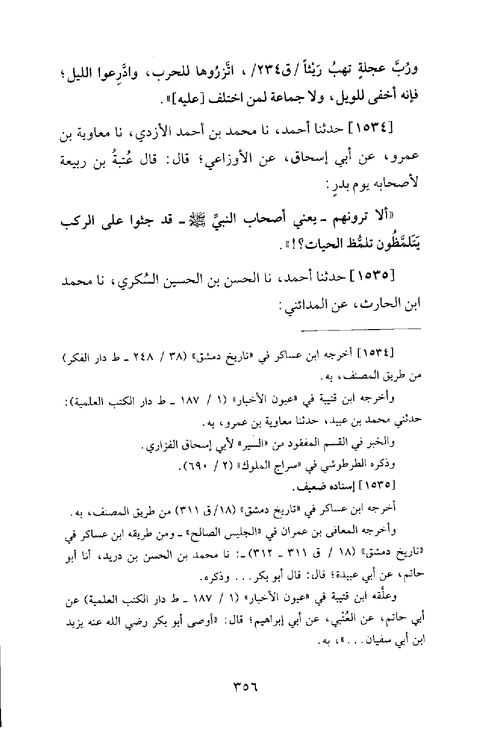 1534 - حَدَّثَنَا أَحْمَدُ، نَا مُحَمَّدُ بْنُ أَحْمَدَ الأَزْدِيُّ، نَا مُعَاوِيَةُ بْنُ عَمْرٍو، عَنْ أَبِي إِسْحَاقَ، عَنِ الأَوْزَاعِيِّ؛ قَالَ: قَالَ عُتْبَةُ بْنُ رَبِيعَةَ لأَصْحَابِهِ يَوْمَ بَدْرٍ: أَلا تَرَوْنَهُمْ - يَعْنِي أَصْحَابَ النَّبِيِّ صَلَّى اللَّهُ عَلَيْهِ وَسَلَّمَ - قَدْ جَثَوْا عَلَى الرُّكَبِ يَتَلَمَّظُونَ تَلَمُّظَ الْحَيَّاتِ؟ !