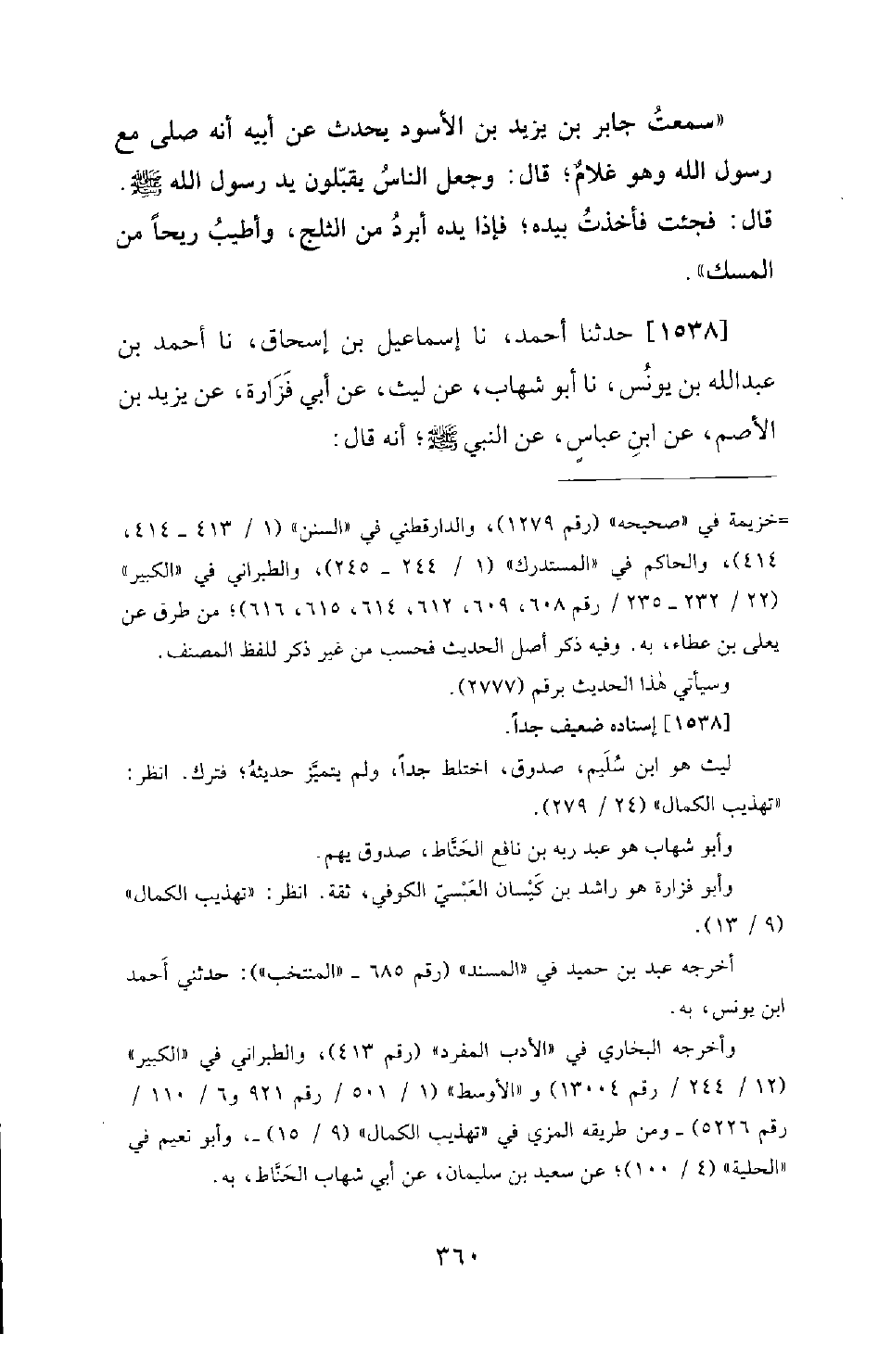 1538 - حَدَّثَنَا أَحْمَدُ، نَا إِسْمَاعِيلُ بْنُ إِسْحَاقَ، نَا أَحْمَدُ بْنُ عَبْدِ اللهِ بْنِ يُونُسَ، نَا أَبُو شِهَابٍ، عَنْ لَيْثٍ، عَنْ أَبِي فَزَارَةَ، عَنْ يَزِيدَ بْنِ الأَصَمِّ، عَنِ ابْنِ عَبَّاسٍ، عَنِ النَّبِيِّ صَلَّى اللَّهُ عَلَيْهِ وَسَلَّمَ؛ أَنَّهُ قَالَ -[361]-: «ثَلاثٌ مَنْ لَمْ يَكُنَّ فِيهِ؛ فَإِنَّ اللهَ تَبَارَكَ وَتَعَالَى يَغْفِرُ مَا سِوَى ذَلِكَ لِمَنْ يَشَاءُ: مَنْ مَاتَ لَمْ يُشْرِكْ بِاللهِ شَيْئًا، وَلَمْ يَكُ سَاحِرًا، وَلَمْ يَحْقِدْ عَلَى أَخِيهِ»