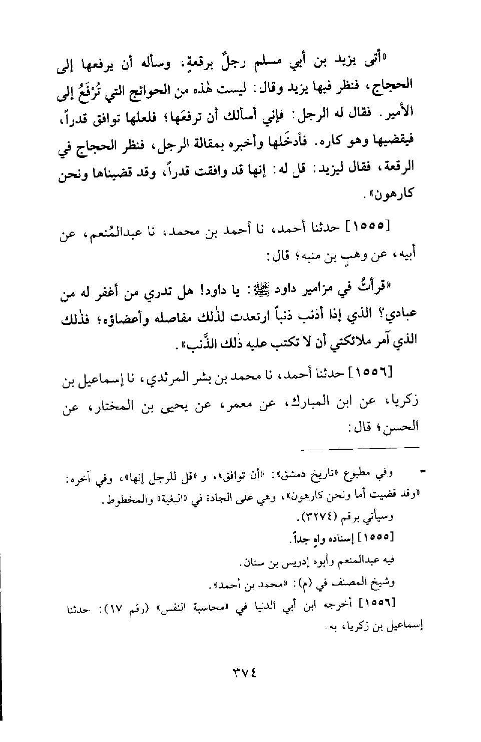 1555 - حَدَّثَنَا أَحْمَدُ، نَا أَحْمَدُ بْنُ مُحَمَّدٍ، نَا عَبْدُ الْمُنْعِمِ، عَنْ أَبِيهِ، عَنْ وَهْبِ بْنِ مُنَبِّهٍ؛ قَالَ: قَرَأْتُ فِي مَزَامِيرِ دَاوُدَ [صَلَّى اللَّهُ عَلَيْهِ وَسَلَّمَ] : يَا دَاوُدُ! هَلْ تَدْرِي مَنْ أَغْفِرُ لَهُ مِنْ عِبَادِي؟ الَّذِي إِذَا أَذْنَبَ ذَنْبًا ارْتَعَدَتْ لِذَلِكَ مَفَاصِلُهُ وَأَعْضَاؤُهُ، فَذَلِكَ الَّذِي آمُرُ مَلائِكَتِي أَنْ لا تَكْتُبَ عَلَيْهِ ذَلِكَ الذَّنْبَ