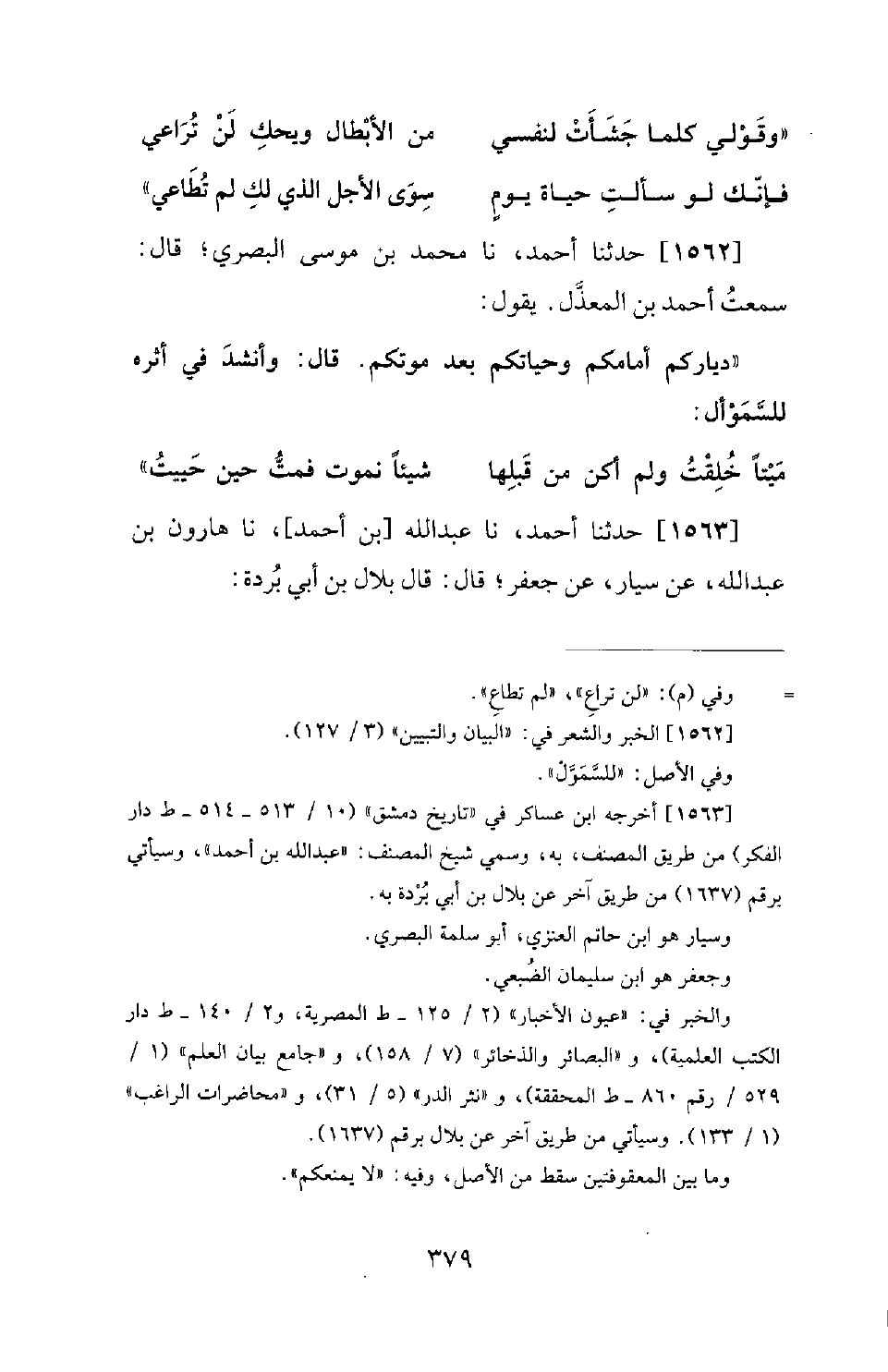 1562 - حَدَّثَنَا أَحْمَدُ، نَا مُحَمَّدُ بْنُ مُوسَى الْبَصْرِيُّ؛ قَالَ: سَمِعْتُ أَحْمَدَ بْنَ الْمُعَذَّلِ، يَقُولُ: دِيَارُكُمْ أَمَامَكُمْ وَحَيَاتُكُمْ بَعْدَ مَوْتِكُمْ. قَالَ: وَأَنْشَدَ فِي أَثَرِهِ لِلسَّمَوْأَلِ: