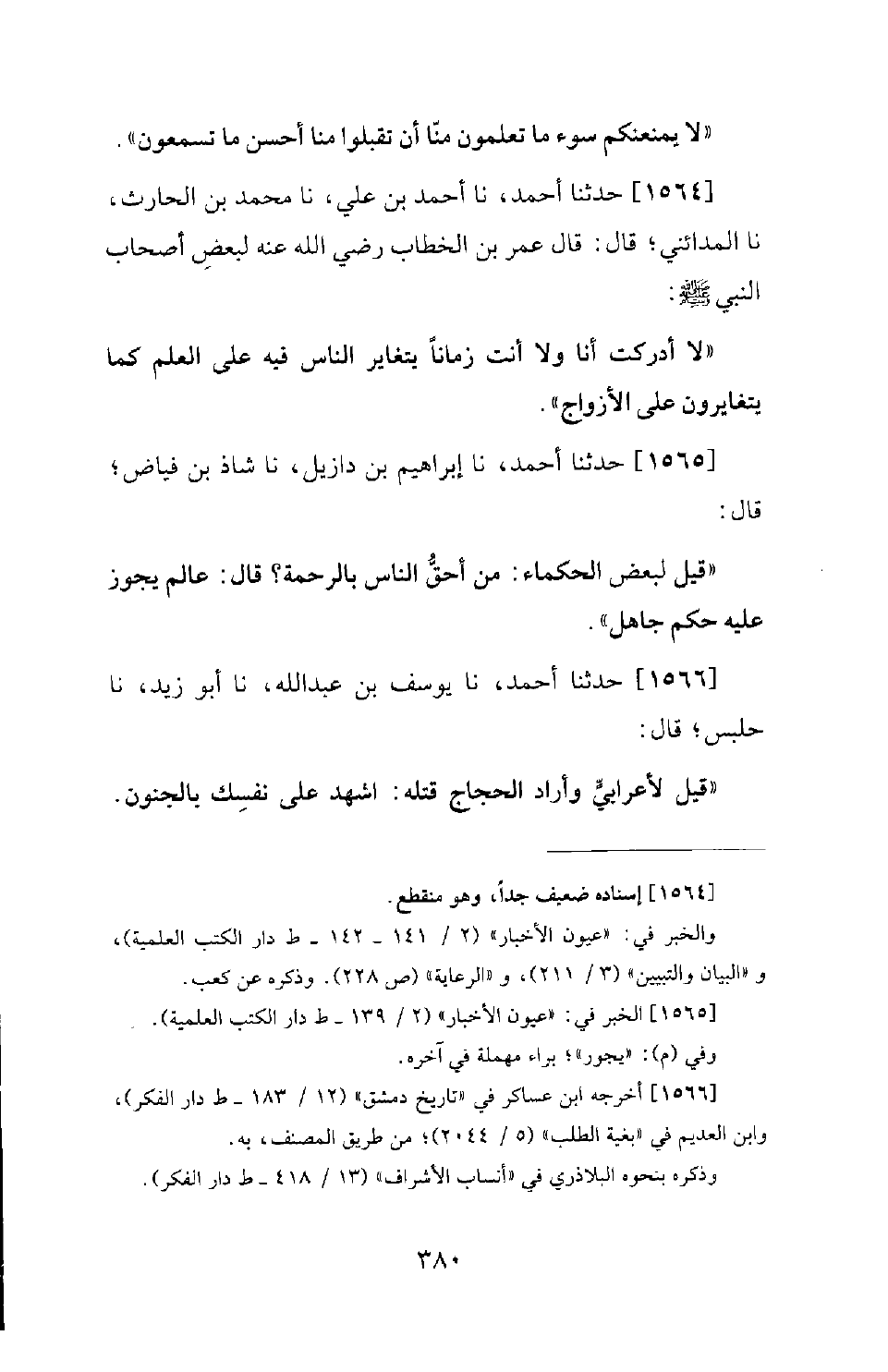 1564 - حَدَّثَنَا أَحْمَدُ، نَا أَحْمَدُ بْنُ عَلِيٍّ، نَا مُحَمَّدُ بْنُ الْحَارِثِ، نَا الْمَدَائِنِيُّ؛ قَالَ: قَالَ عُمَرُ بْنُ الْخَطَّابِ رَضِيَ اللهُ عَنْهُ لِبَعْضِ أَصْحَابِ النَّبِيِّ صَلَّى اللَّهُ عَلَيْهِ وَسَلَّمَ: لا أَدْرَكْتُ أَنَا وَلا أَنْتَ زَمَانًا يَتَغَايَرُ النَّاسُ فِيهِ عَلَى الْعِلْمِ كَمَا يَتَغَايَرُونَ عَلَى الأَزْوَاجِ