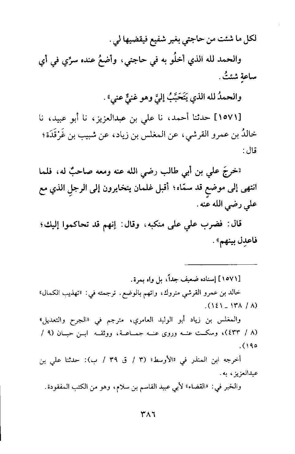 1571 - حَدَّثَنَا أَحْمَدُ، نَا عَلِيُّ بْنُ عَبْدِ الْعَزِيزِ، نَا أَبُو عُبَيْدٍ، نَا خَالِدُ بْنُ عَمْرٍو الْقُرَشِيُّ، عَنِ الْمُغَلِّسِ بْنِ زِيَادٍ، عَنْ شَبِيبِ بْنِ غَرْقَدَةَ؛ قَالَ: خَرَجَ عَلِيُّ بْنُ أَبِي طَالِبٍ رَضِيَ اللهُ عَنْهُ وَمَعَهُ صَاحِبٌ لَهُ، فَلَمَّا انْتَهَى إِلَى مَوْضِعٍ قَدْ سَمَّاهُ؛ أَقْبَلَ غِلْمَانٌ يَتَخَايَرُونَ إِلَى الرَّجُلِ الَّذِي مَعَ عَلِيٍّ رَضِيَ اللهُ عَنْهُ. قَالَ: فَضَرَبَ عَلِيٌّ عَلَى مَنْكِبِهِ، وَقَالَ: إِنَّهُمْ قَدْ تَحَاكَمُوا إِلَيْكَ؛ فَاعْدِلْ بَيْنَهُمْ