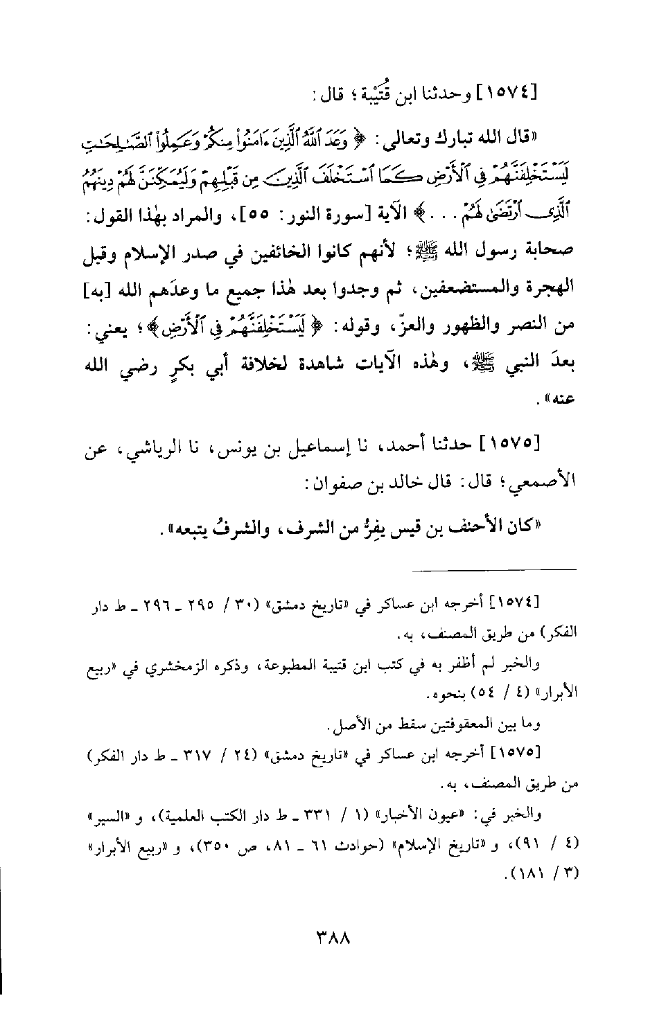 1574 - وحدثتا ابْنُ قُتَيْبَةَ؛ قَالَ: قَالَ اللهُ تَبَارَكَ وَتَعَالَى: (وَعَدَ اللهُ الَّذِينَ آمَنُوا مِنْكُمْ وَعَمِلُوا الصَّالِحَاتِ لَيَسْتَخْلِفَنَّهُمْ فِي الأَرْضِ كَمَا اسْتَخْلَفَ الَّذِينَ مِنْ قَبْلِهِمْ وَلَيُمَكِّنَنَّ لَهُمْ دِينَهُمُ الَّذِي ارْتَضَى لَهُمْ) الآية [النور: 55] ، وَالْمُرَادُ بِهَذَا الْقَوْلِ: صحابه رَسُولِ اللهِ صَلَّى اللَّهُ عَلَيْهِ وَسَلَّمَ؛ لأَنَّهُمْ كَانُوا الْخَائِفِينَ فِي صَدْرِ الْإِسْلامِ وَقَبْلَ الْهِجْرَةِ وَالْمُسْتَضْعَفِينَ، ثُمَّ وَجَدُوا بَعْدَ هَذَا جَمِيعَ مَا وَعَدَهُمُ اللهُ بِهِ مِنَ النَّصْرِ وَالظُّهُورِ وَالْعِزِّ، وَقَوْلِهِ: {لَيَسْتَخْلِفَنَّهُمْ فِي الأَرْضِ} ؛ يَعْنِي: بَعْدَ النَّبِيِّ صَلَّى اللَّهُ عَلَيْهِ وَسَلَّمَ، وَهَذِهِ الآيَاتُ شَاهِدَةٌ لِخِلافَةِ أَبِي بَكْرٍ رَضِيَ اللهُ عَنْهُ.