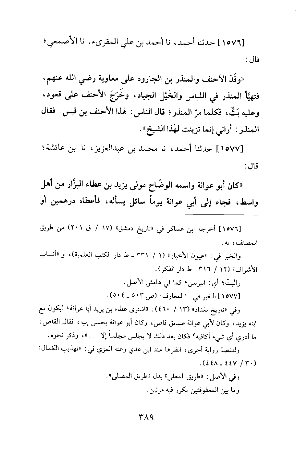 1576 - حَدَّثَنَا أَحْمَدُ، نَا أَحْمَدُ بْنُ عَلِيٍّ الْمُقْرِئُ، نَا الْأَصْمَعِيُّ؛ قَالَ: وَفَدَ الْأَحْنَفُ وَالْمُنْذِرُ بْنُ الْجَارُودِ عَلَى مُعَاوِيَةَ رَضِيَ اللهُ عَنْهُمْ، فَتَهَيَّأَ الْمُنْذِرُ فِي اللِّبَاسِ وَالْخَيْلِ الْجِيَادِ، وَخَرَجَ الْأَحْنَفُ عَلَى قَعُودٍ، وَعَلَيْهِ بَتٌّ، فَكُلَّمَا مَرَّ الْمُنْذِرُ؛ قَالَ: النَّاسُ: هَذَا الْأَحْنَفُ بْنُ قَيْسٍ. فَقَالَ الْمُنْذِرُ: أَرَانِي إِنَّمَا تَزَيَّنْتُ لِهَذَا الشَّيْخِ.