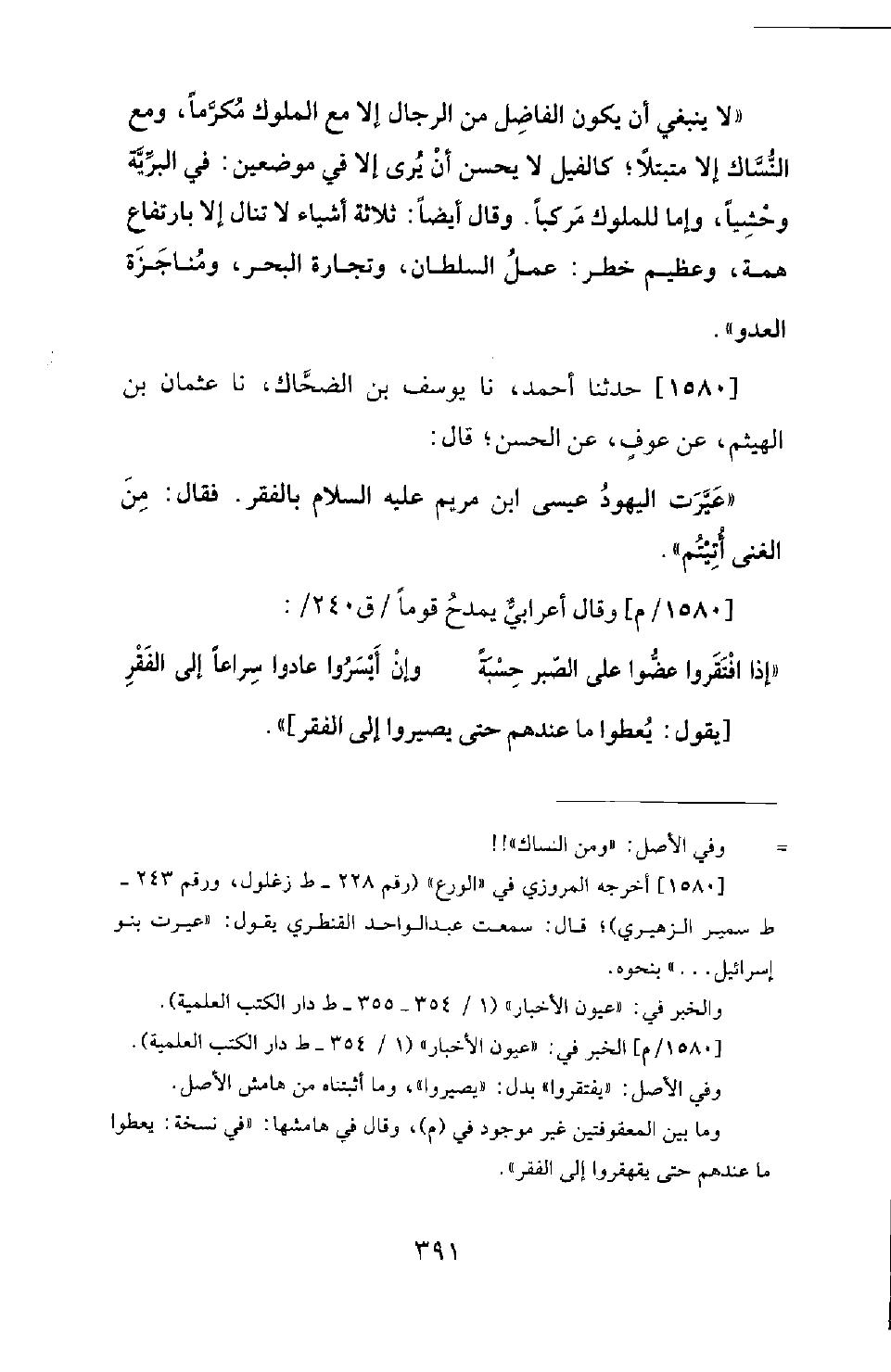 1580 - حَدَّثَنَا أَحْمَدُ، نَا يُوسُفُ بْنُ الضَّحَّاكِ، نَا عُثْمَانُ بْنُ الْهَيْثَمِ، عَنْ عَوْفٍ، عَنِ الْحَسَنِ؛ قَالَ: عَيَّرَتِ الْيَهُودُ عِيسَى ابْنَ مَرْيَمَ عَلَيْهِ السَّلامُ بِالْفَقْرِ. فَقَالَ: مِنَ الْغِنَى أُتِيتُمْ.
