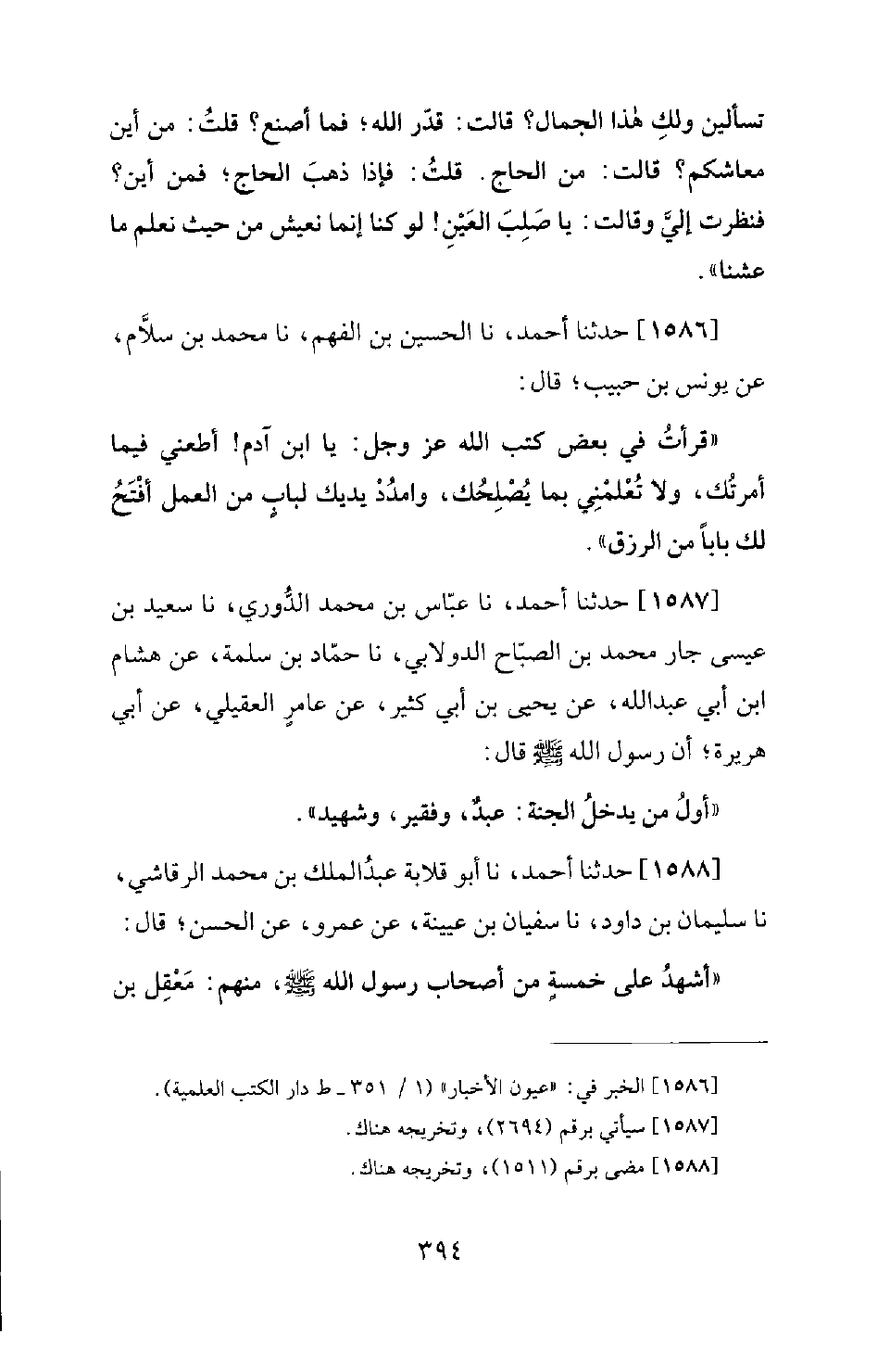 1587 - حَدَّثَنَا أَحْمَدُ، نَا عَبَّاسُ بْنُ مُحَمَّدٍ الدُّورِيُّ، نَا سَعِيدُ بْنُ عِيسَى جَارُ مُحَمَّدِ بْنِ الصَّبَّاحِ الدَّوْلابِيِّ، نَا حَمَّادُ بْنُ سَلَمَةَ، عَنْ هِشَامِ بْنِ أَبِي عَبْدِ اللهِ، عَنْ يَحْيَى بْنِ أَبِي كَثِيرٍ، عَنْ عَامِرٍ الْعُقَيْلِيِّ، عَنْ أَبِي هُرَيْرَةَ؛ أَنَّ رَسُولَ اللهِ صَلَّى اللَّهُ عَلَيْهِ وَسَلَّمَ قَالَ: «أَوَّلُ مَنْ يَدْخُلُ الْجَنَّةَ: عَبْدٌ، وَفَقِيرٌ، وَشَهِيدٌ» .