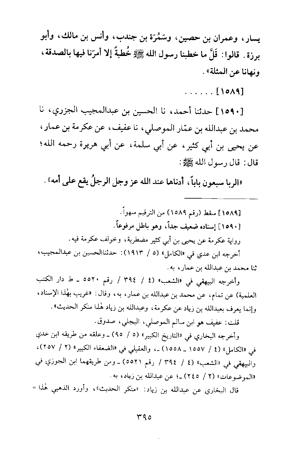 1590 - حَدَّثَنَا أَحْمَدُ، نَا الحسين بْنُ عَبْدِ الْمُجِيبِ الْجَزَرِيُّ، نَا مُحَمَّدُ بْنُ عَبْدِ اللهِ بْنِ عَمَّارٍ الْمَوْصِلِيُّ، نَا عَفِيفٌ، عَنْ عِكْرِمَةَ بْنِ عَمَّارٍ، عَنْ يَحْيَى بْنِ أَبِي كَثِيرٍ، عَنْ أَبِي سَلَمَةَ، عَنْ أَبِي هُرَيْرَةَ رَحِمَهُ اللهُ؛ قَالَ: قَالَ رَسُولُ اللهِ صَلَّى اللَّهُ عَلَيْهِ وَسَلَّمَ: «الرِّبَا سَبْعُونَ بَابًا، أَدْنَاهَا عِنْدَ اللهِ عَزَّ وَجَلَّ الرَّجُلُ يَقَعُ عَلَى أُمِّهِ»