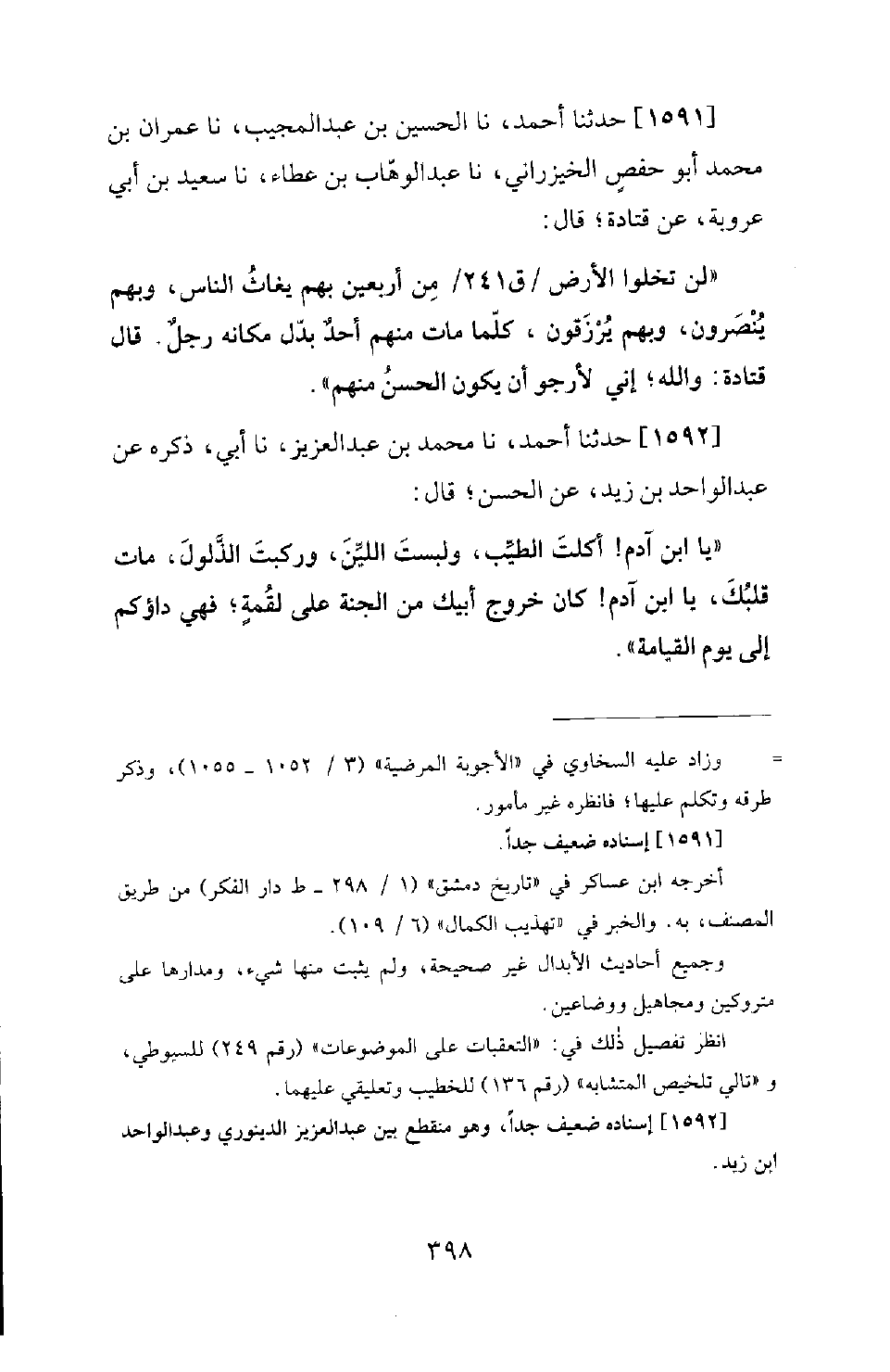 1591 - حَدَّثَنَا أحمد، نا الحسين بْنُ عَبْدِ الْمُجِيبِ، نَا عِمْرَانُ بْنُ مُحَمَّدٍ أَبُو حَفْصٍ الْخَيْزَرَانِيُّ، نَا عَبْدُ الْوَهَّابِ بْنُ عَطَاءٍ، نَا سَعِيدُ بْنُ أَبِي عَرُوبَةَ، عَنْ قَتَادَةَ؛ قَالَ: لَنْ تخلوا الأَرْضُ مِنْ أَرْبَعِينَ بِهِمْ يُغَاثُ النَّاسُ، وَبِهِمْ يُنْصَرُونَ، وَبِهِمْ يُرْزَقُونَ، كُلَّمَا مَاتَ مِنْهُمْ أَحَدٌ بُدِّلَ مَكَانَهُ رَجُلٌ. قَالَ قَتَادَةَ: وَاللهِ! إِنِّي لأَرْجُو أَنْ يَكُونَ الْحَسَنُ مِنْهُمْ