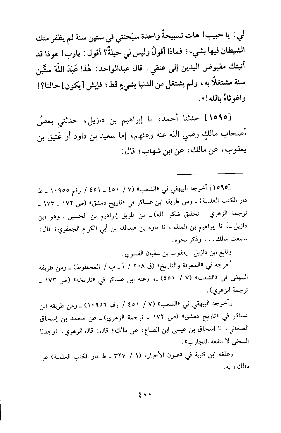 1595 - حَدَّثَنَا أَحْمَدُ، نَا إِبْرَاهِيمُ بْنُ دَازِيلَ، حَدَّثَنِي بَعْضُ أَصْحَابِ مَالِكٍ رَضِيَ اللهُ عَنْهُ وَعَنْهُمْ، إِمَّا سَعِيدُ بْنُ دَاوُدَ أَوْ عَتِيقُ بْنُ يَعْقُوبَ، عَنْ مَالِكٍ، عَنِ ابْنِ شِهَابٍ؛ قَالَ: -[401]- الْكَرِيمُ لا تحكمه التجارب.